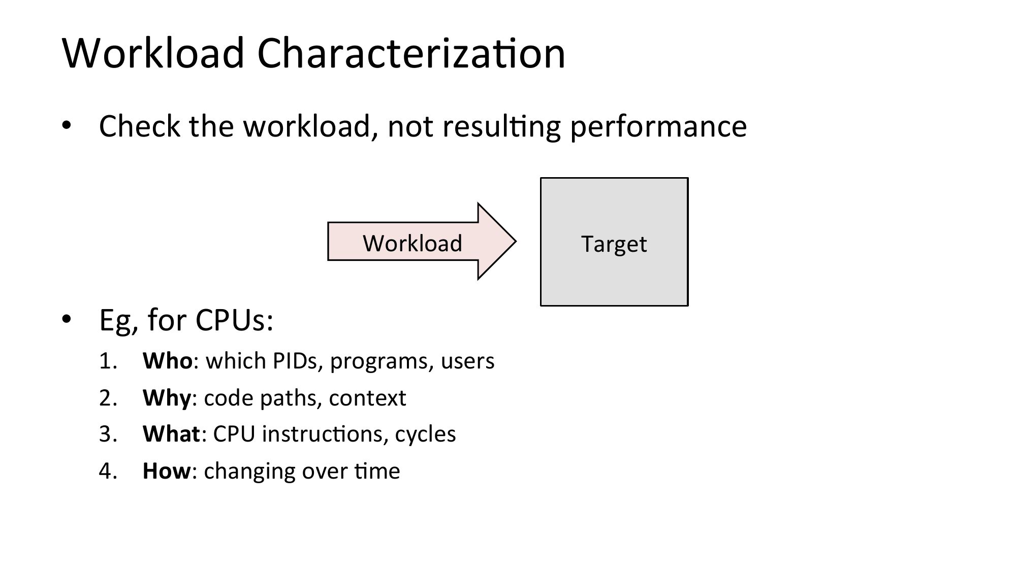 Workload CharacterizaNon • Check the workload, not resulNng performance Workload • Eg, for CPUs: Who: which PIDs, programs, users Why: code paths, context What: CPU instrucNons, cycles How: changing over Nme Targetslide 20: