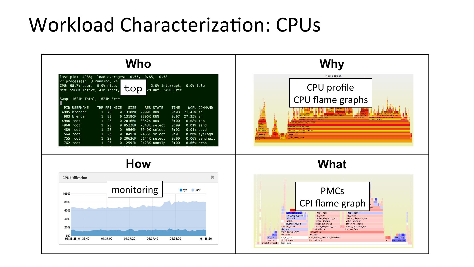 Workload CharacterizaNon: CPUs Who Why top CPU profile CPU flame graphs How What monitoring PMCs CPI flame graphslide 21: