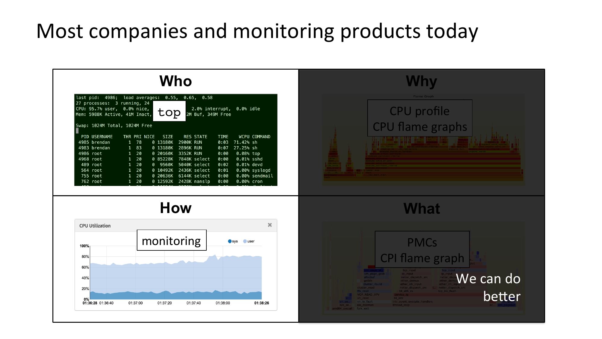 Most companies and monitoring products today Who Why top CPU profile CPU flame graphs How What monitoring PMCs CPI flame graph We can do bejerslide 22: