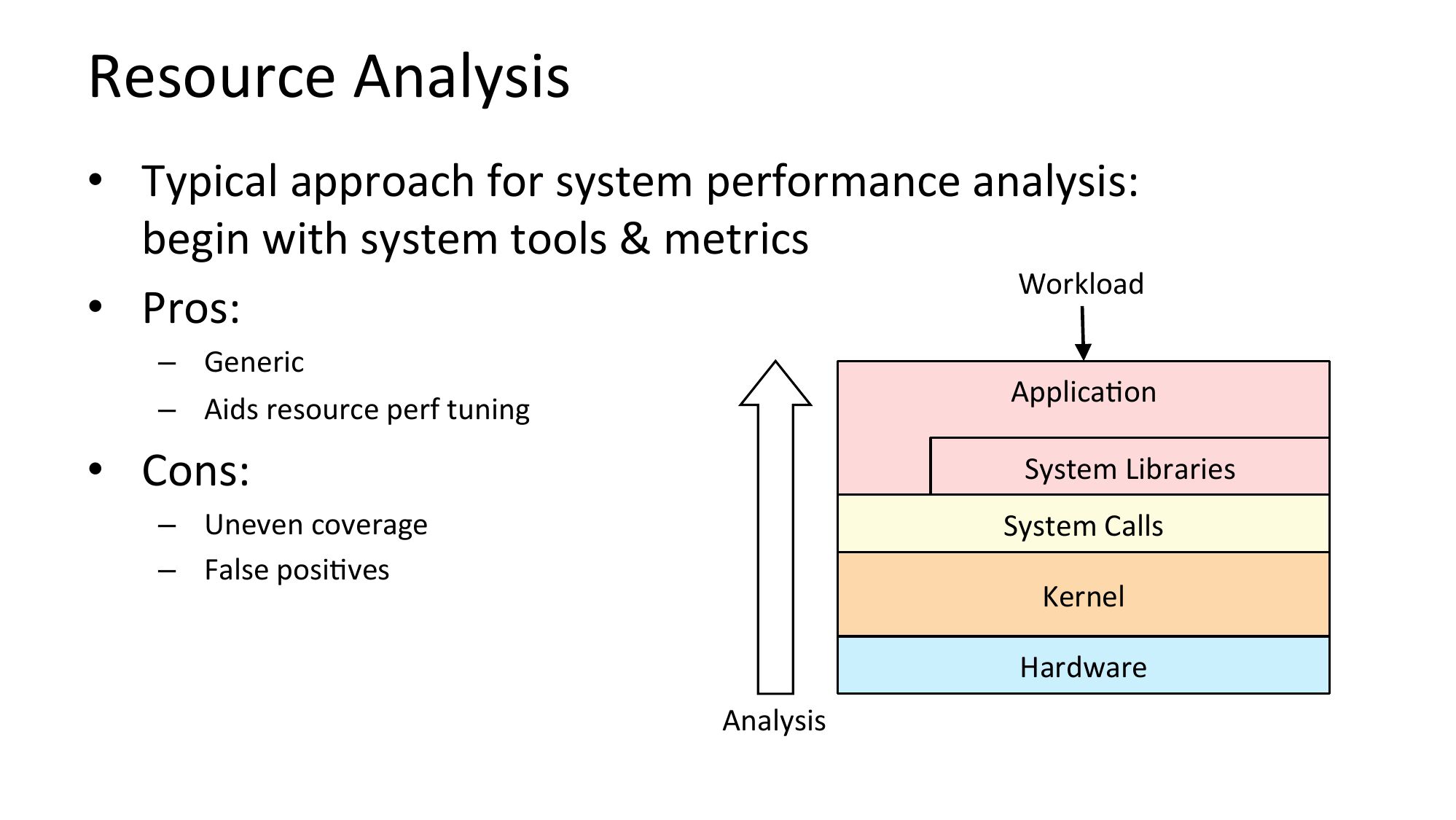 Resource Analysis • Typical approach for system performance analysis: begin with system tools & metrics Workload • Pros: – Generic – Aids resource perf tuning ApplicaNon • Cons: System Libraries – Uneven coverage – False posiNves System Calls Kernel Hardware Analysisslide 23: