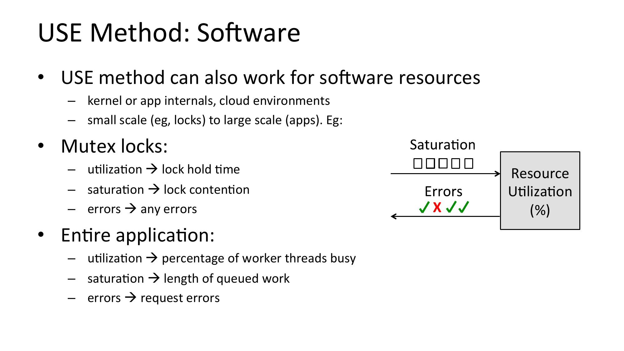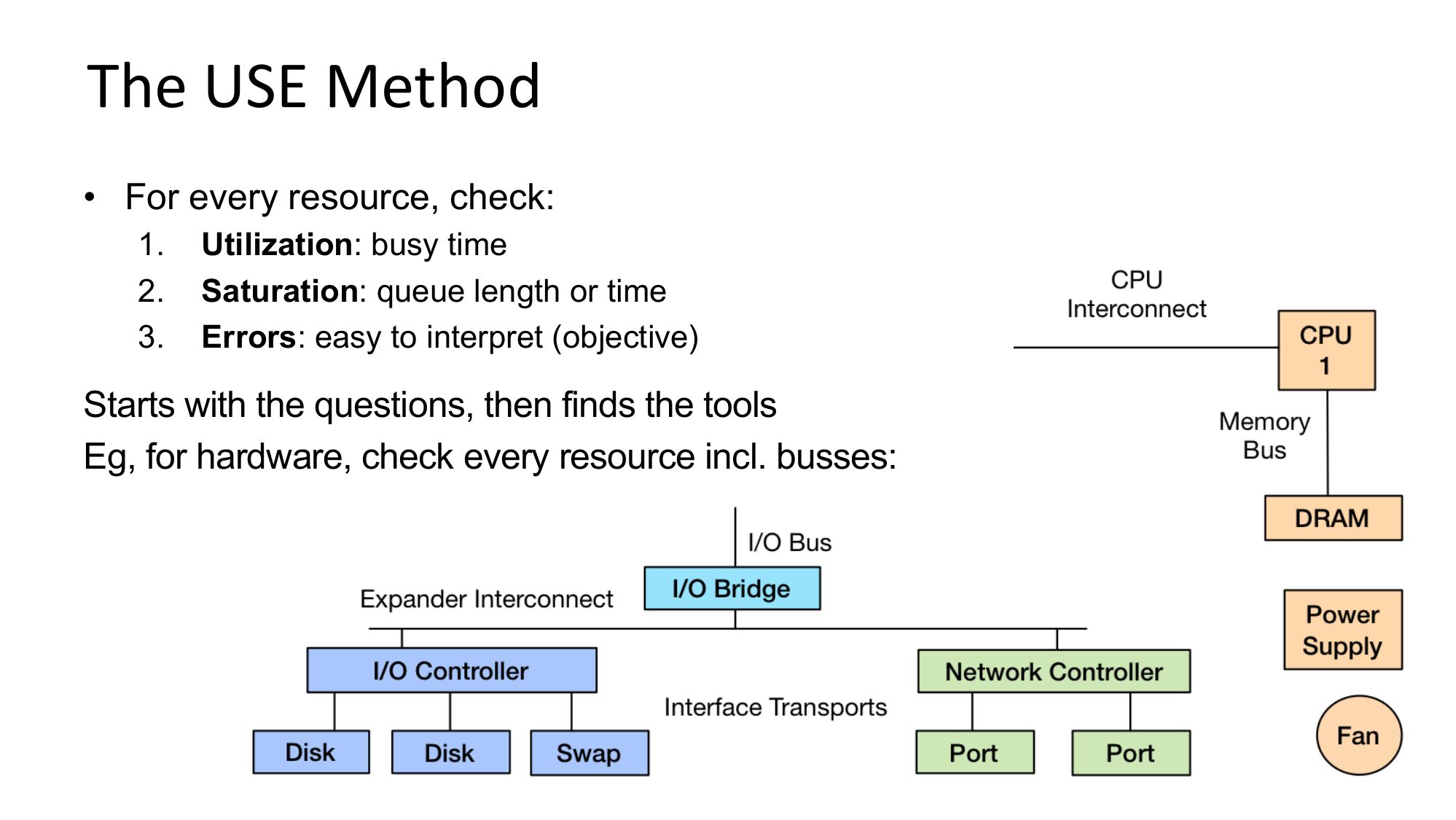 The USE Method • For every resource, check: Utilization: busy time Saturation: queue length or time Errors: easy to interpret (objective) Starts with the questions, then finds the tools Eg, for hardware, check every resource incl. busses:slide 24: