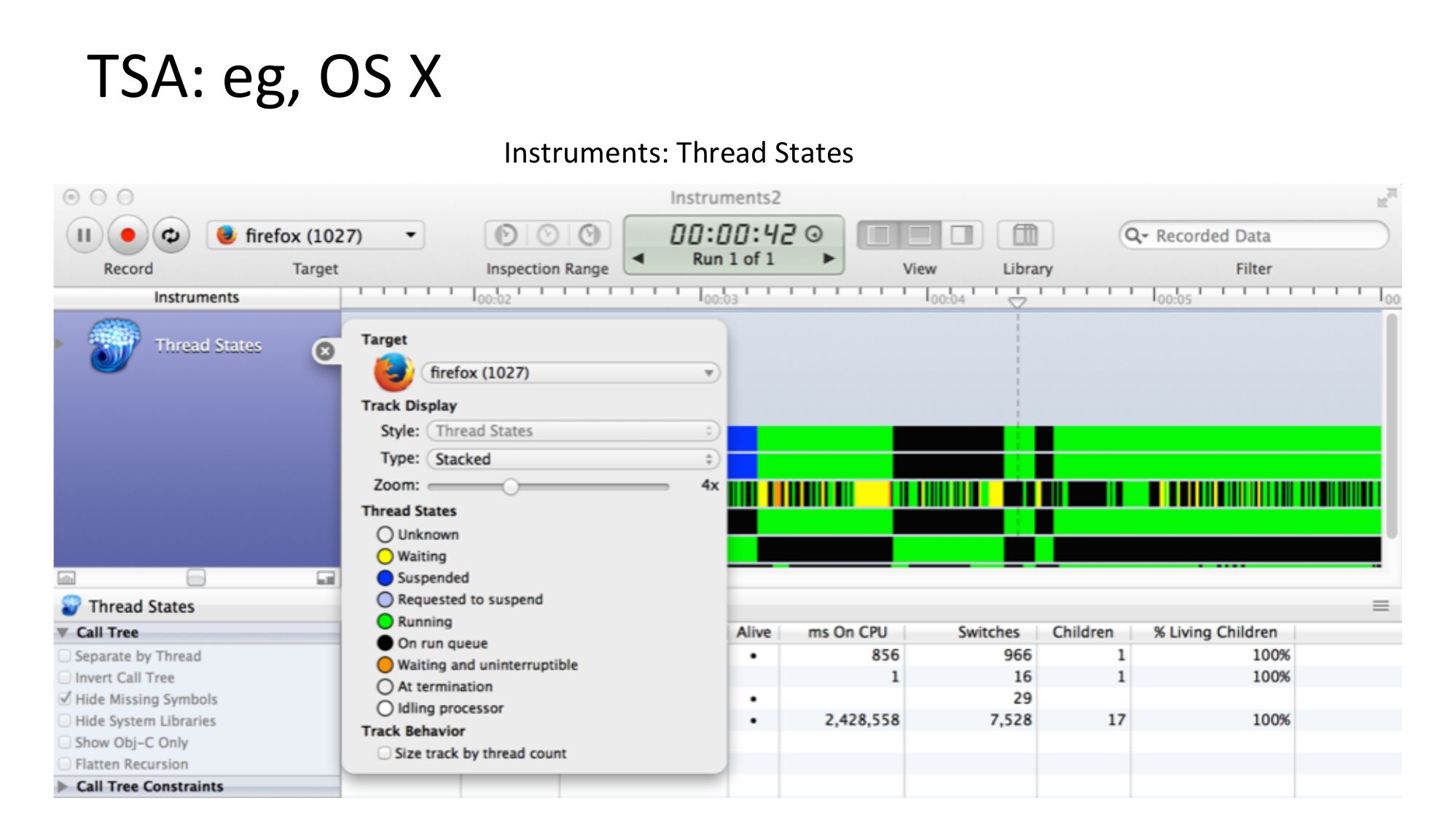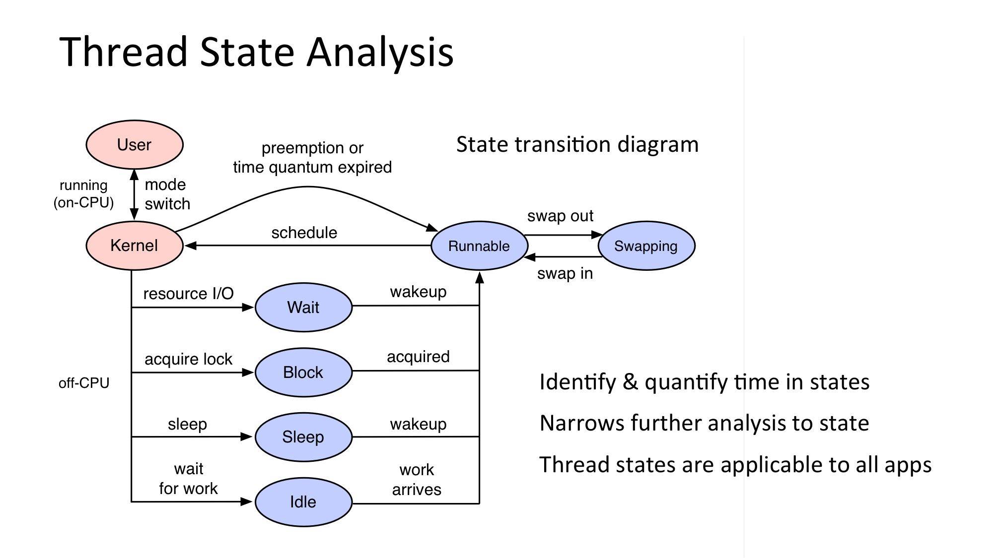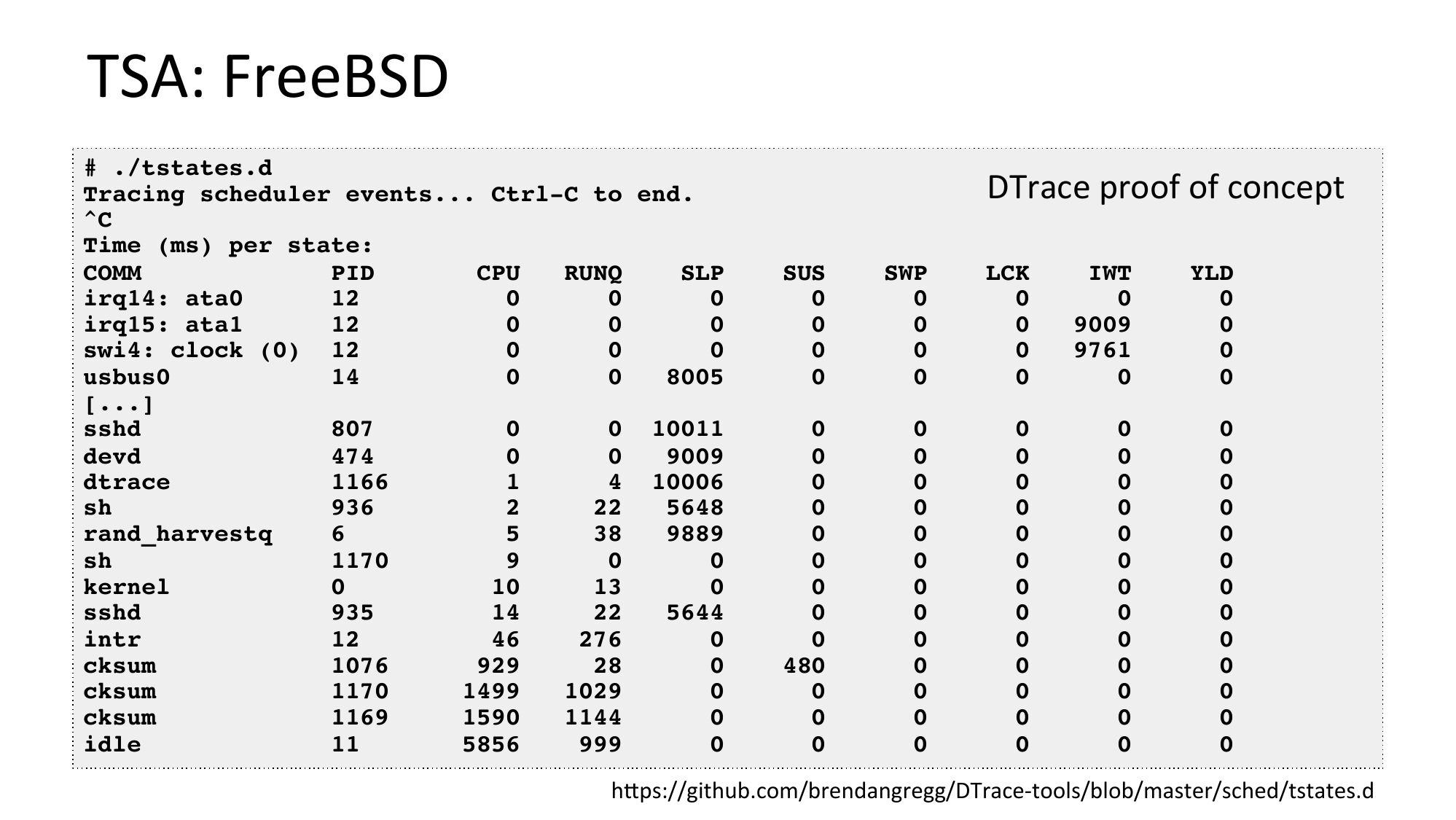 slide 34:TSA: FreeBSD # ./tstates.d Tracing scheduler events... Ctrl-C to end. Time (ms) per state: COMM PID CPU RUNQ SLP irq14: ata0 irq15: ata1 swi4: clock (0) 12 usbus0 [...] sshd 0 10011 devd dtrace 4 10006 rand_harvestq kernel sshd intr cksum cksum cksum idle DTrace proof of concept SUS SWP LCK IWT YLD hjps://github.com/brendangregg/DTrace-tools/blob/master/sched/tstates.dslide 35: