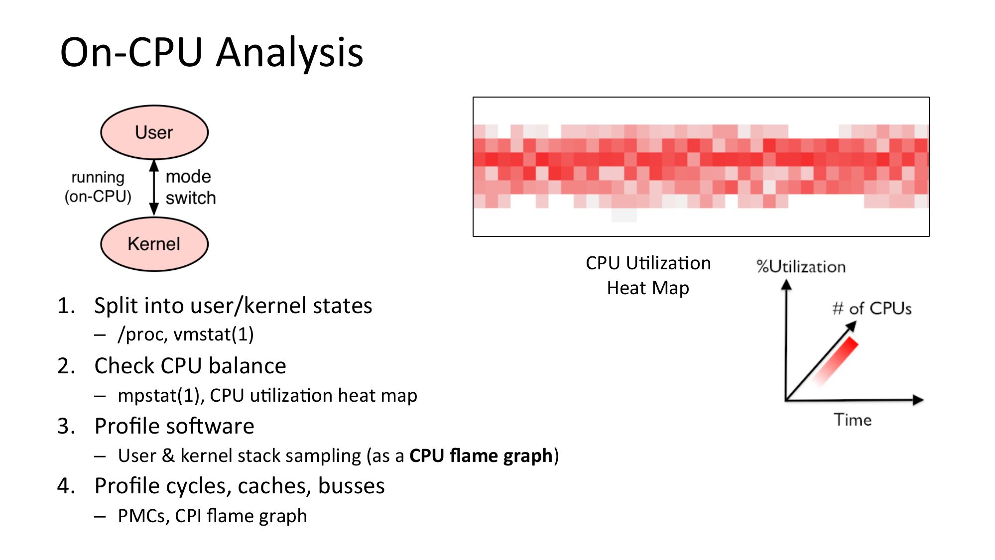 On-CPU Analysis 1. Split into user/kernel states – /proc, vmstat(1) 2. Check CPU balance – mpstat(1), CPU uNlizaNon heat map 3. Profile soRware – User & kernel stack sampling (as a CPU flame graph) 4. Profile cycles, caches, busses – PMCs, CPI flame graph CPU UNlizaNon Heat Mapslide 36: