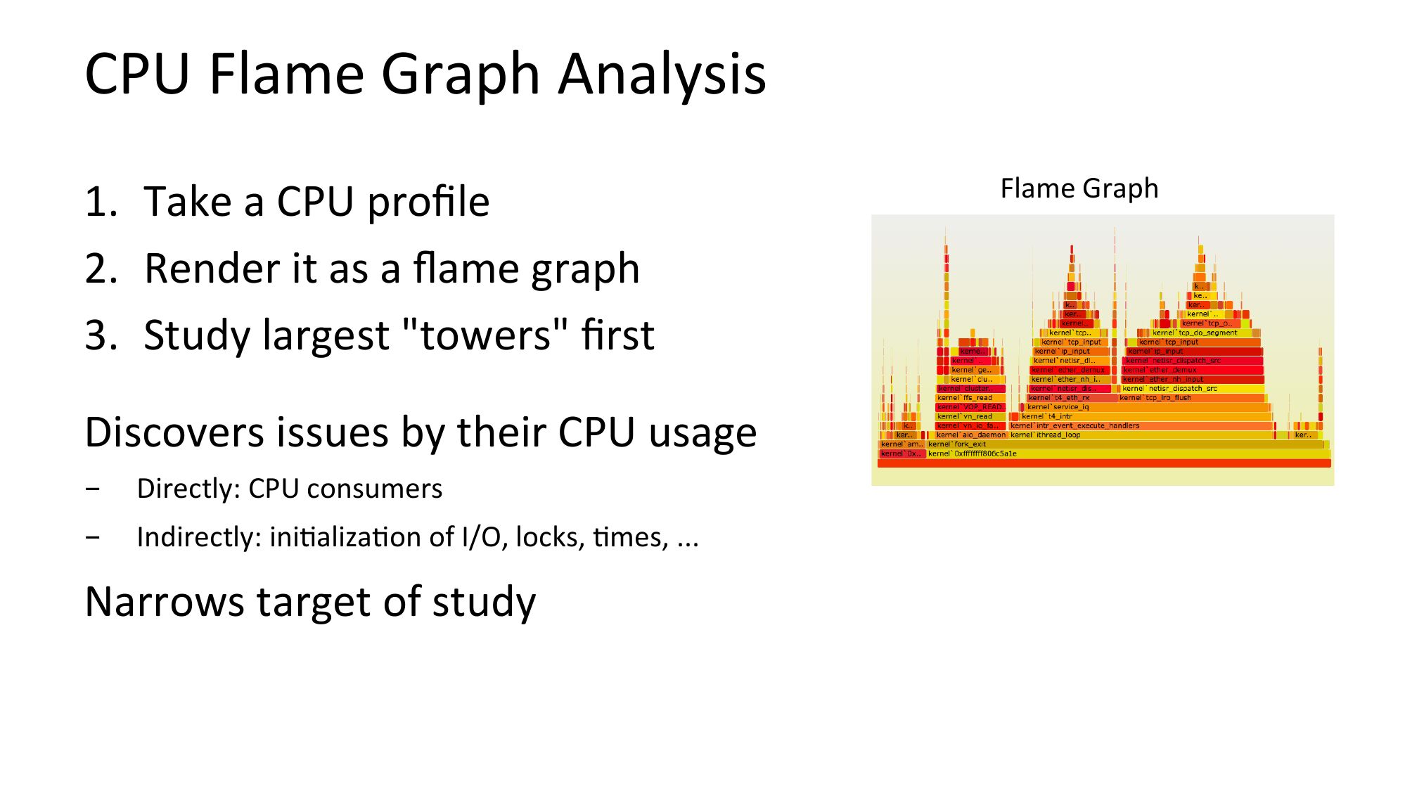 CPU Flame Graph Analysis 1. Take a CPU profile 2. Render it as a flame graph 3. Study largest "towers" first Discovers issues by their CPU usage Directly: CPU consumers Indirectly: iniNalizaNon of I/O, locks, Nmes, ... Narrows target of study Flame Graphslide 37: