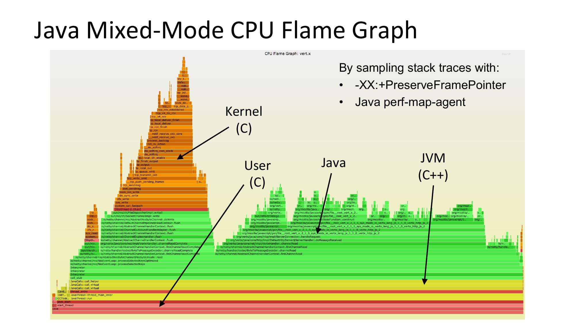 slide 38:Java Mixed-Mode CPU Flame Graph Kernel (C) User (C) By sampling stack traces with: • -XX:+PreserveFramePointer • Java perf-map-agent Java JVM (C++)slide 39: