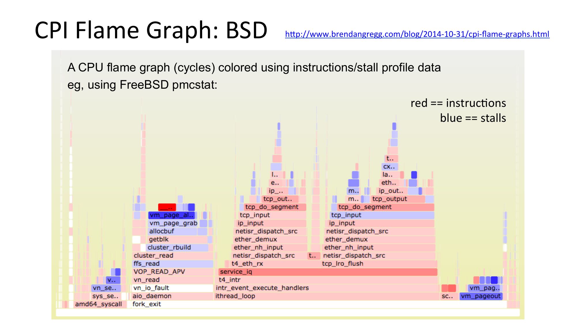 CPI Flame Graph: BSD hjp://www.brendangregg.com/blog/2014-10-31/cpi-flame-graphs.html A CPU flame graph (cycles) colored using instructions/stall profile data eg, using FreeBSD pmcstat: red == instrucNons blue == stallsslide 40: