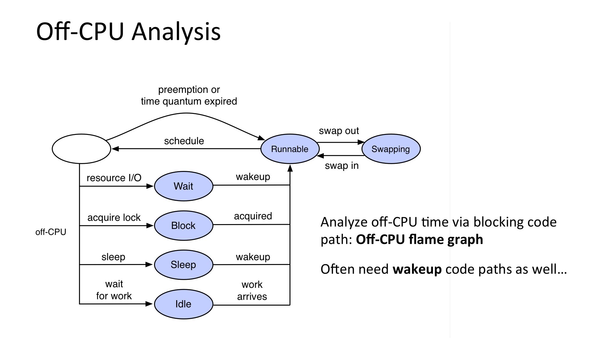 Off-CPU Analysis Analyze off-CPU Nme via blocking code path: Off-CPU flame graph ORen need wakeup code paths as well…slide 41: