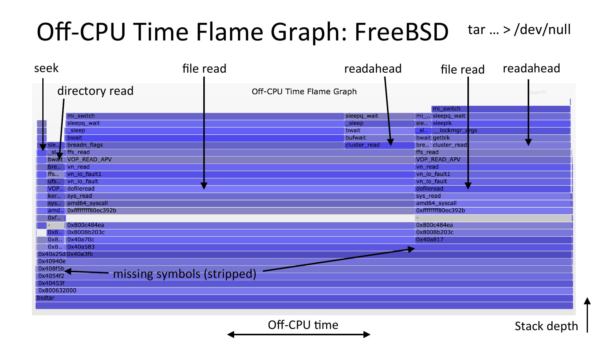 Off-CPU Time Flame Graph: FreeBSD tar … >gt; /dev/null seek readahead file read file read readahead directory read missing symbols (stripped) Off-CPU Nme Stack depthslide 42: