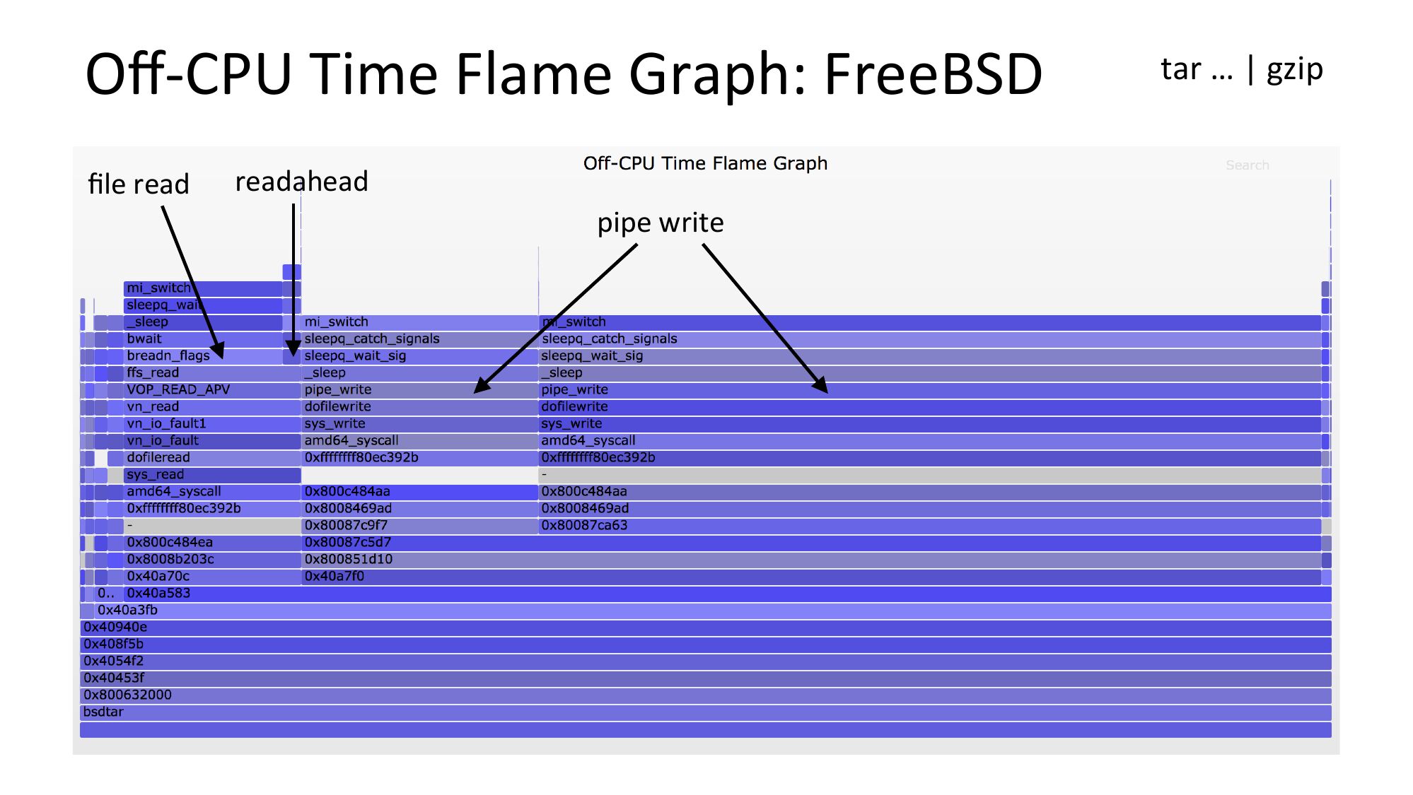 slide 43:Off-CPU Time Flame Graph: FreeBSD file read readahead pipe write tar … | gzipslide 44: