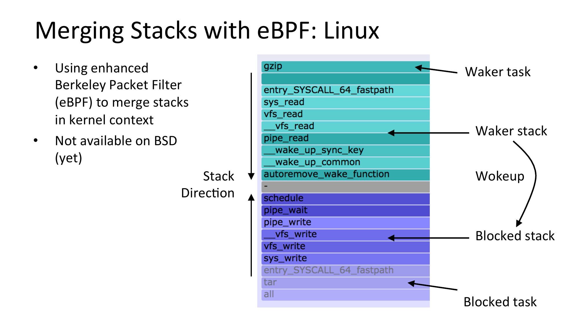 slide 46:Merging Stacks with eBPF: Linux Using enhanced Berkeley Packet Filter (eBPF) to merge stacks in kernel context Not available on BSD (yet) Stack DirecNon Waker task Waker stack Wokeup Blocked stack Blocked taskslide 47: