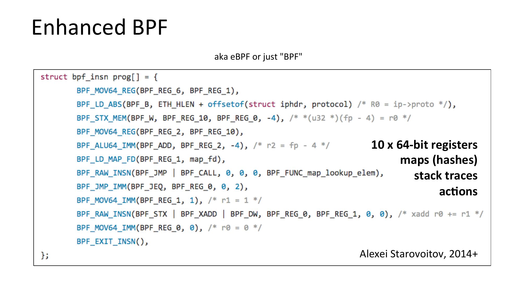 Enhanced BPF aka eBPF or just "BPF" 10 x 64-bit registers maps (hashes) stack traces ac=ons Alexei Starovoitov, 2014+slide 49: