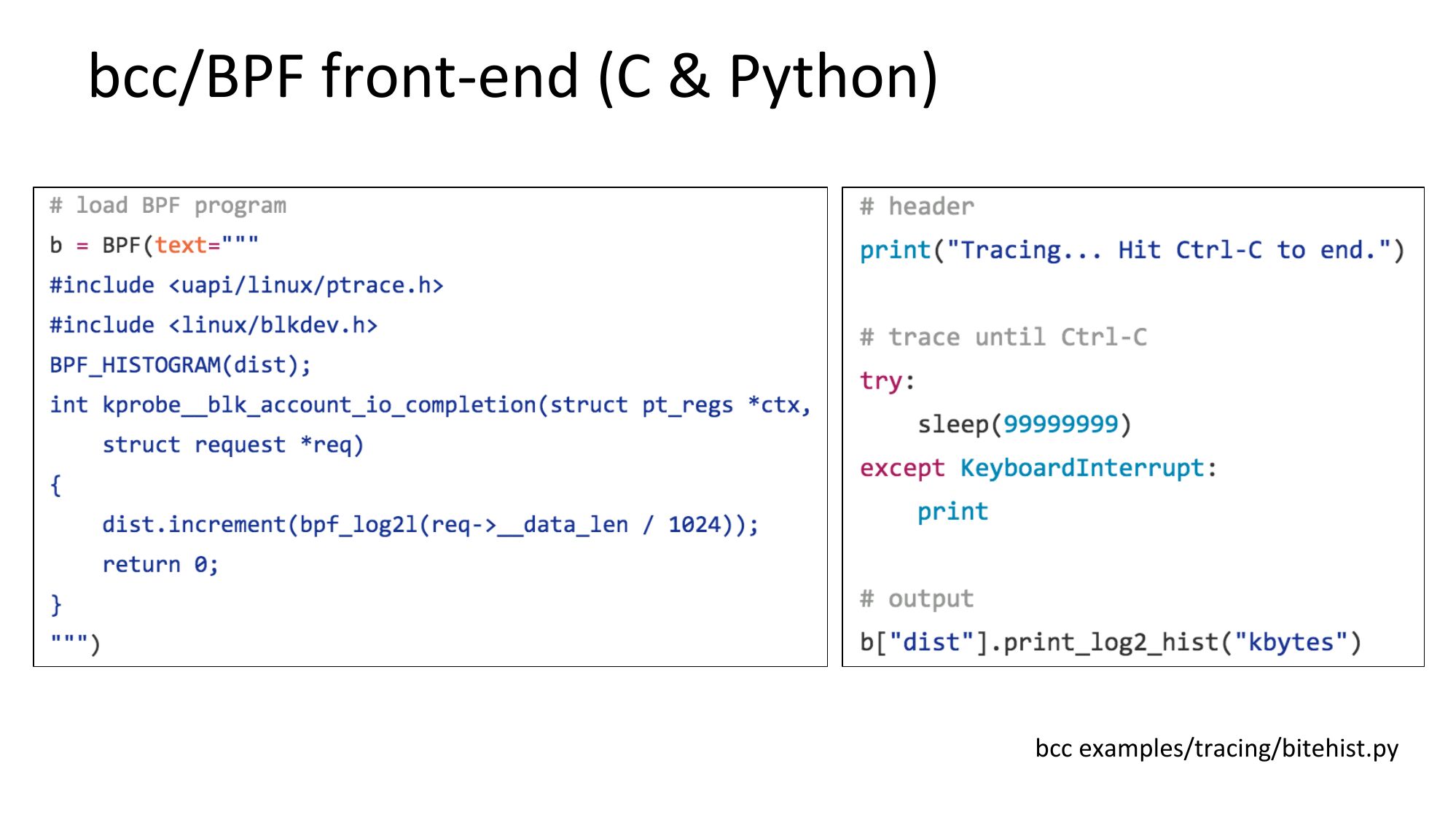bcc/BPF front-end (C & Python) bcc examples/tracing/bitehist.pyslide 50:
