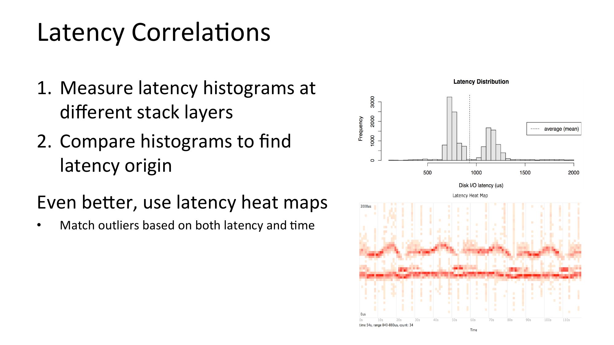 Latency CorrelaNons 1. Measure latency histograms at different stack layers 2. Compare histograms to find latency origin Even bejer, use latency heat maps Match outliers based on both latency and Nmeslide 51: