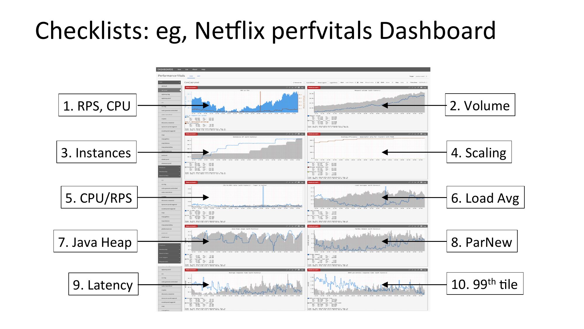 Checklists: eg, Neylix perfvitals Dashboard 1. RPS, CPU 2. Volume 3. Instances 4. Scaling 5. CPU/RPS 6. Load Avg 7. Java Heap 8. ParNew 9. Latency 10. 99th Nleslide 53: