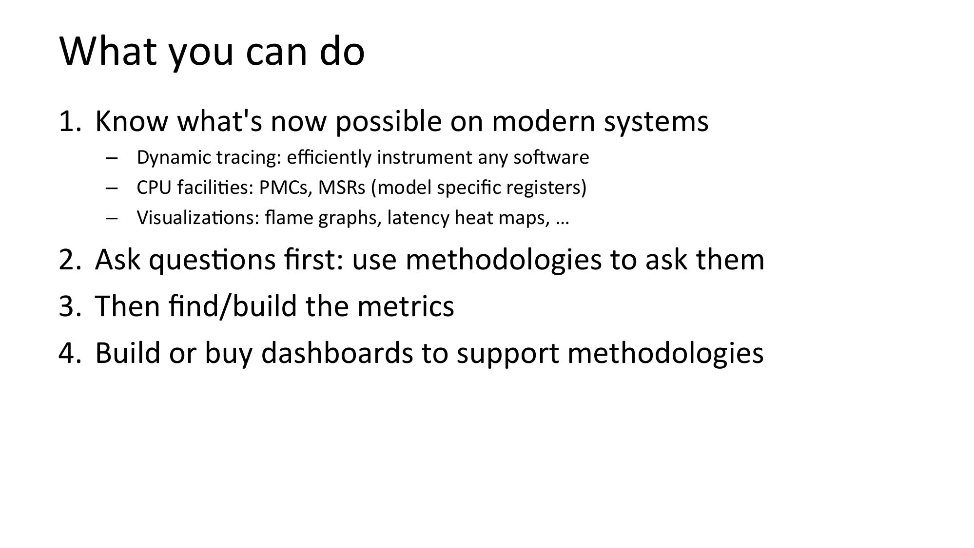 What you can do 1. Know what's now possible on modern systems – Dynamic tracing: efficiently instrument any soRware – CPU faciliNes: PMCs, MSRs (model specific registers) – VisualizaNons: flame graphs, latency heat maps, … 2. Ask quesNons first: use methodologies to ask them 3. Then find/build the metrics 4. Build or buy dashboards to support methodologiesslide 59: