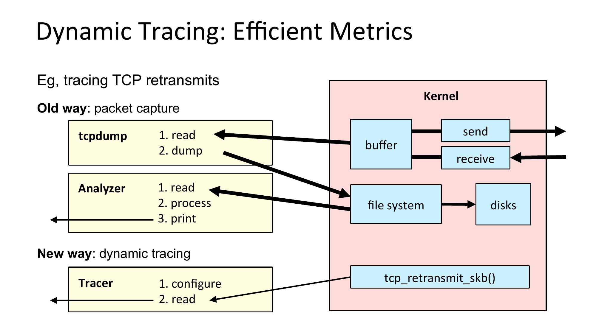 Dynamic Tracing: Efficient Metrics Eg, tracing TCP retransmits Kernel Old way: packet capture tcpdump Analyzer 1. read 2. dump buffer 1. read 2. process 3. print file system send receive disks New way: dynamic tracing Tracer 1. configure 2. read tcp_retransmit_skb()slide 60: