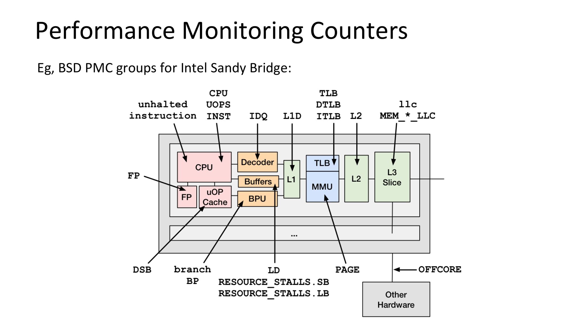 Performance Monitoring Counters Eg, BSD PMC groups for Intel Sandy Bridge:slide 62: