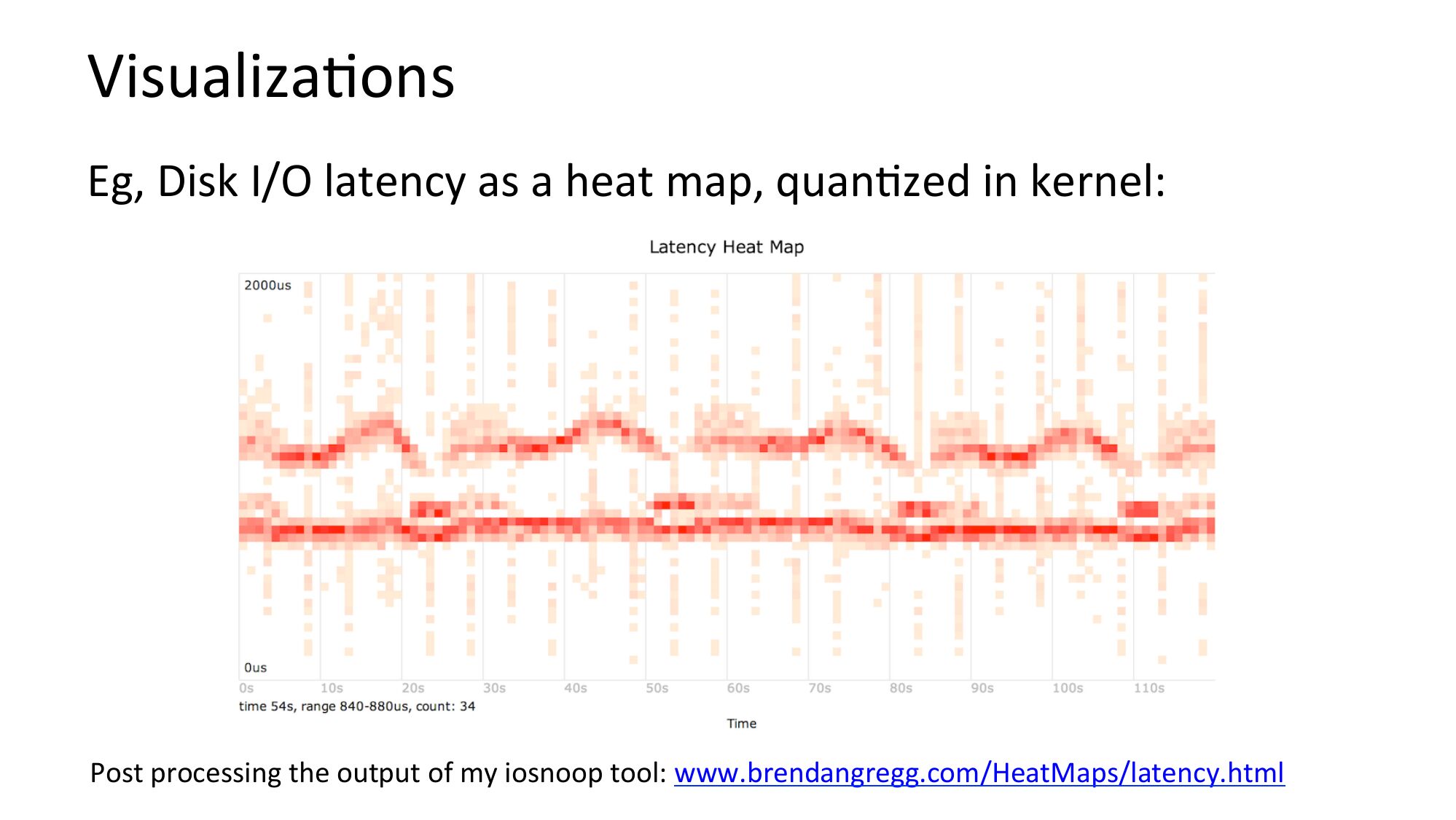 VisualizaNons Eg, Disk I/O latency as a heat map, quanNzed in kernel: Post processing the output of my iosnoop tool: www.brendangregg.com/HeatMaps/latency.htmlslide 63: