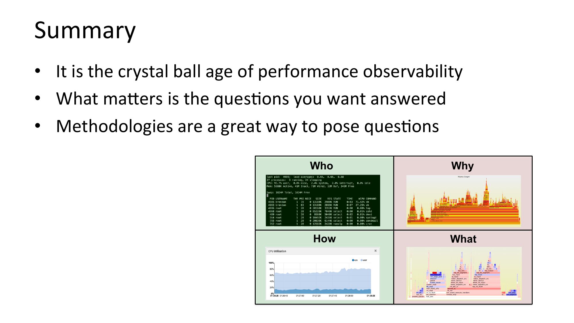 Summary • It is the crystal ball age of performance observability • What majers is the quesNons you want answered • Methodologies are a great way to pose quesNons Who Why How Whatslide 64: