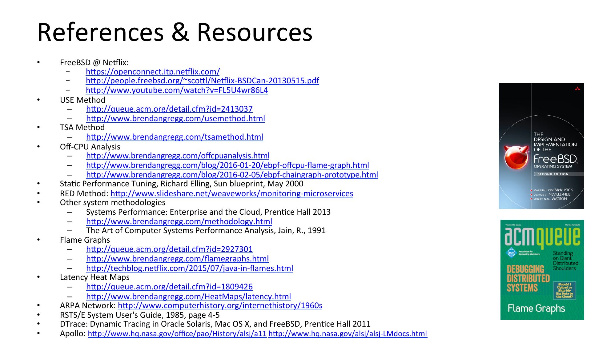 References & Resources FreeBSD @ Neylix: hjps://openconnect.itp.neylix.com/ hjp://people.freebsd.org/~scojl/Neylix-BSDCan-20130515.pdf hjp://www.youtube.com/watch?v=FL5U4wr86L4 USE Method hjp://queue.acm.org/detail.cfm?id=2413037 hjp://www.brendangregg.com/usemethod.html TSA Method hjp://www.brendangregg.com/tsamethod.html Off-CPU Analysis hjp://www.brendangregg.com/offcpuanalysis.html hjp://www.brendangregg.com/blog/2016-01-20/ebpf-offcpu-flame-graph.html hjp://www.brendangregg.com/blog/2016-02-05/ebpf-chaingraph-prototype.html StaNc Performance Tuning, Richard Elling, Sun blueprint, May 2000 RED Method: hjp://www.slideshare.net/weaveworks/monitoring-microservices Other system methodologies Systems Performance: Enterprise and the Cloud, PrenNce Hall 2013 hjp://www.brendangregg.com/methodology.html The Art of Computer Systems Performance Analysis, Jain, R., 1991 Flame Graphs hjp://queue.acm.org/detail.cfm?id=2927301 hjp://www.brendangregg.com/flamegraphs.html hjp://techblog.neylix.com/2015/07/java-in-flames.html Latency Heat Maps hjp://queue.acm.org/detail.cfm?id=1809426 hjp://www.brendangregg.com/HeatMaps/latency.html ARPA Network: hjp://www.computerhistory.org/internethistory/1960s RSTS/E System User's Guide, 1985, page 4-5 DTrace: Dynamic Tracing in Oracle Solaris, Mac OS X, and FreeBSD, PrenNce Hall 2011 Apollo: hjp://www.hq.nasa.gov/office/pao/History/alsj/a11 hjp://www.hq.nasa.gov/alsj/alsj-LMdocs.htmlslide 65: