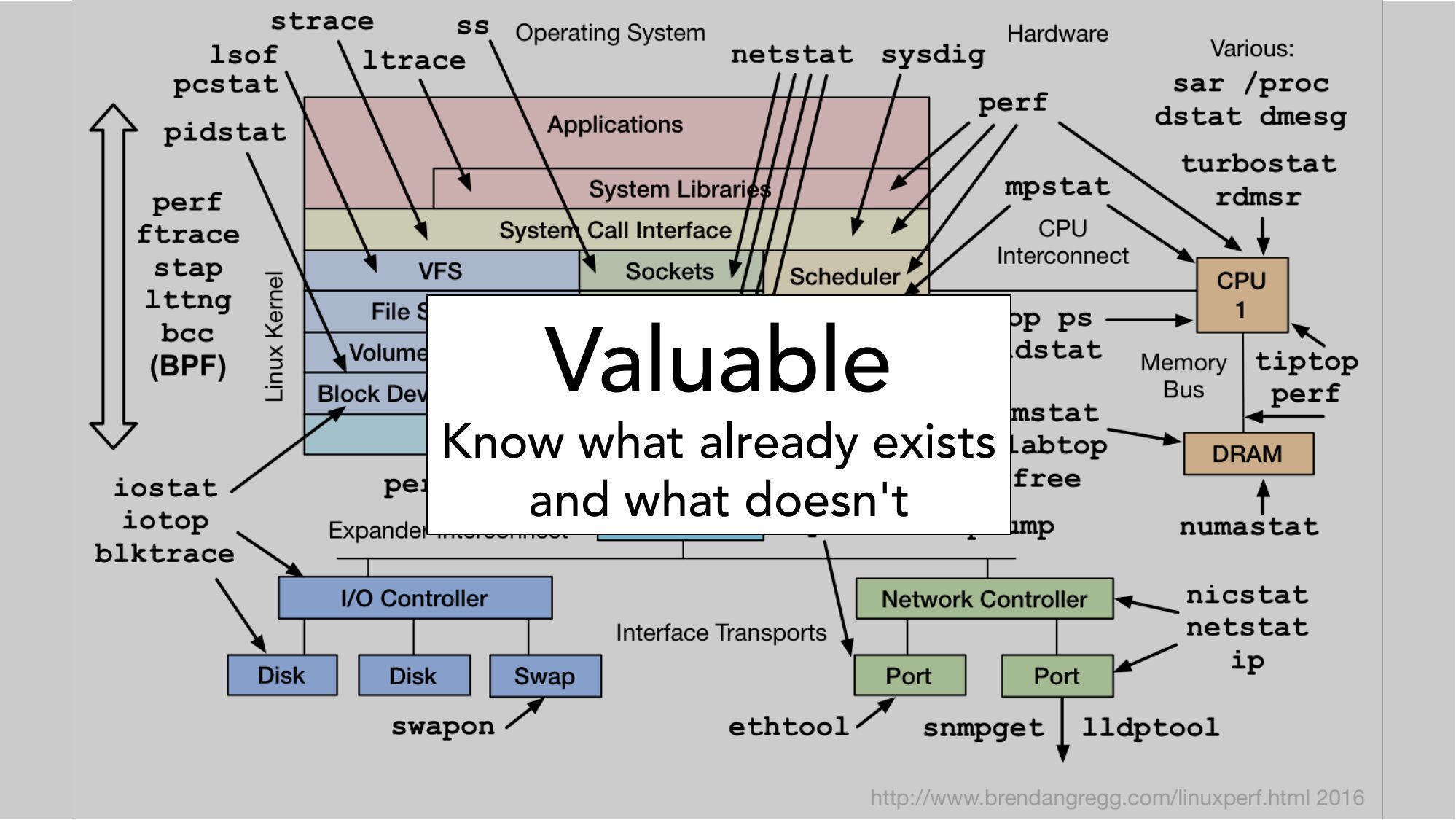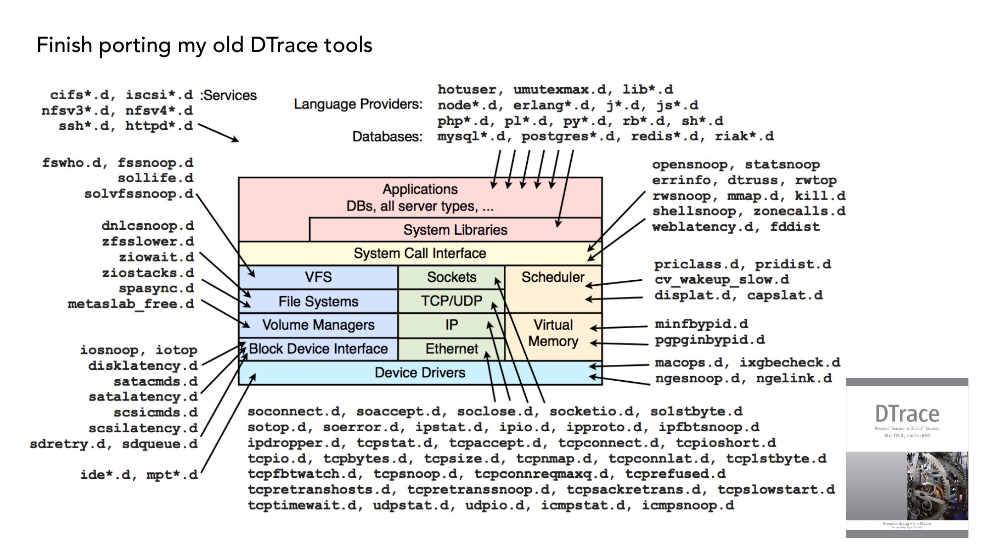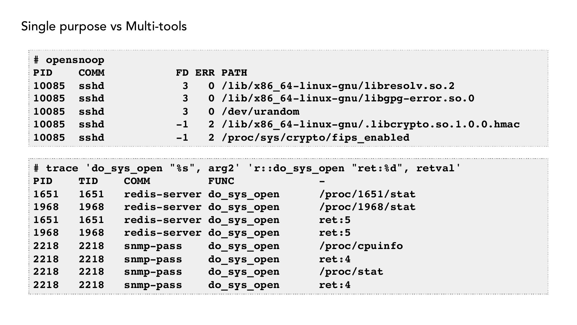 Single purpose vs Multi-tools # opensnoop PID COMM 10085 sshd 10085 sshd 10085 sshd 10085 sshd 10085 sshd FD ERR PATH 0 /lib/x86_64-linux-gnu/libresolv.so.2 0 /lib/x86_64-linux-gnu/libgpg-error.so.0 0 /dev/urandom 2 /lib/x86_64-linux-gnu/.libcrypto.so.1.0.0.hmac 2 /proc/sys/crypto/fips_enabled # trace 'do_sys_open "%s", arg2' 'r::do_sys_open "ret:%d", retval' PID TID COMM FUNC redis-server do_sys_open /proc/1651/stat redis-server do_sys_open /proc/1968/stat redis-server do_sys_open ret:5 redis-server do_sys_open ret:5 snmp-pass do_sys_open /proc/cpuinfo snmp-pass do_sys_open ret:4 snmp-pass do_sys_open /proc/stat snmp-pass do_sys_open ret:4slide 15: