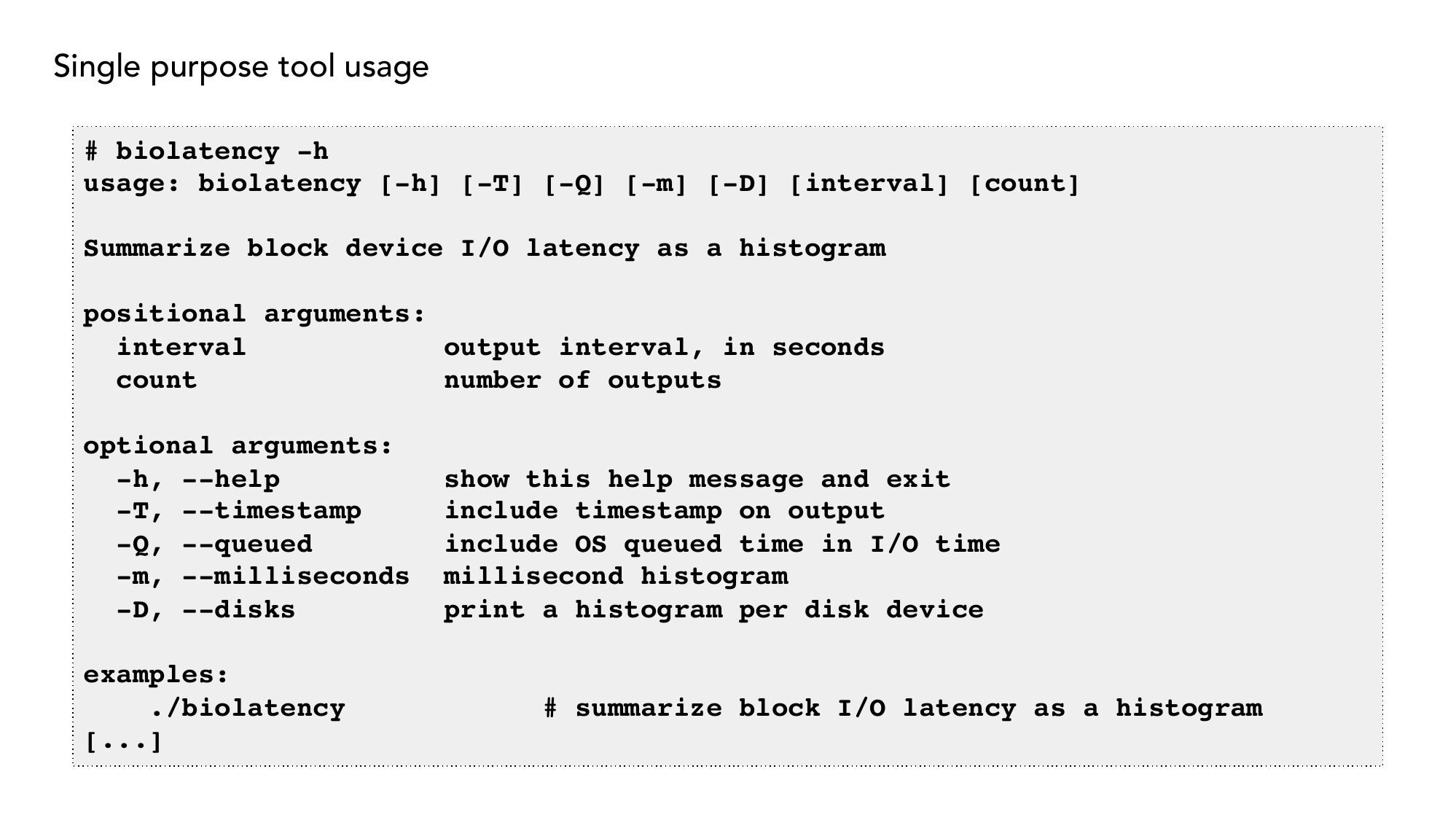 Single purpose tool usage # biolatency -h usage: biolatency [-h] [-T] [-Q] [-m] [-D] [interval] [count] Summarize block device I/O latency as a histogram positional arguments: interval output interval, in seconds count number of outputs optional arguments: -h, --help -T, --timestamp -Q, --queued -m, --milliseconds -D, --disks examples: ./biolatency [...] show this help message and exit include timestamp on output include OS queued time in I/O time millisecond histogram print a histogram per disk device # summarize block I/O latency as a histogramslide 16: