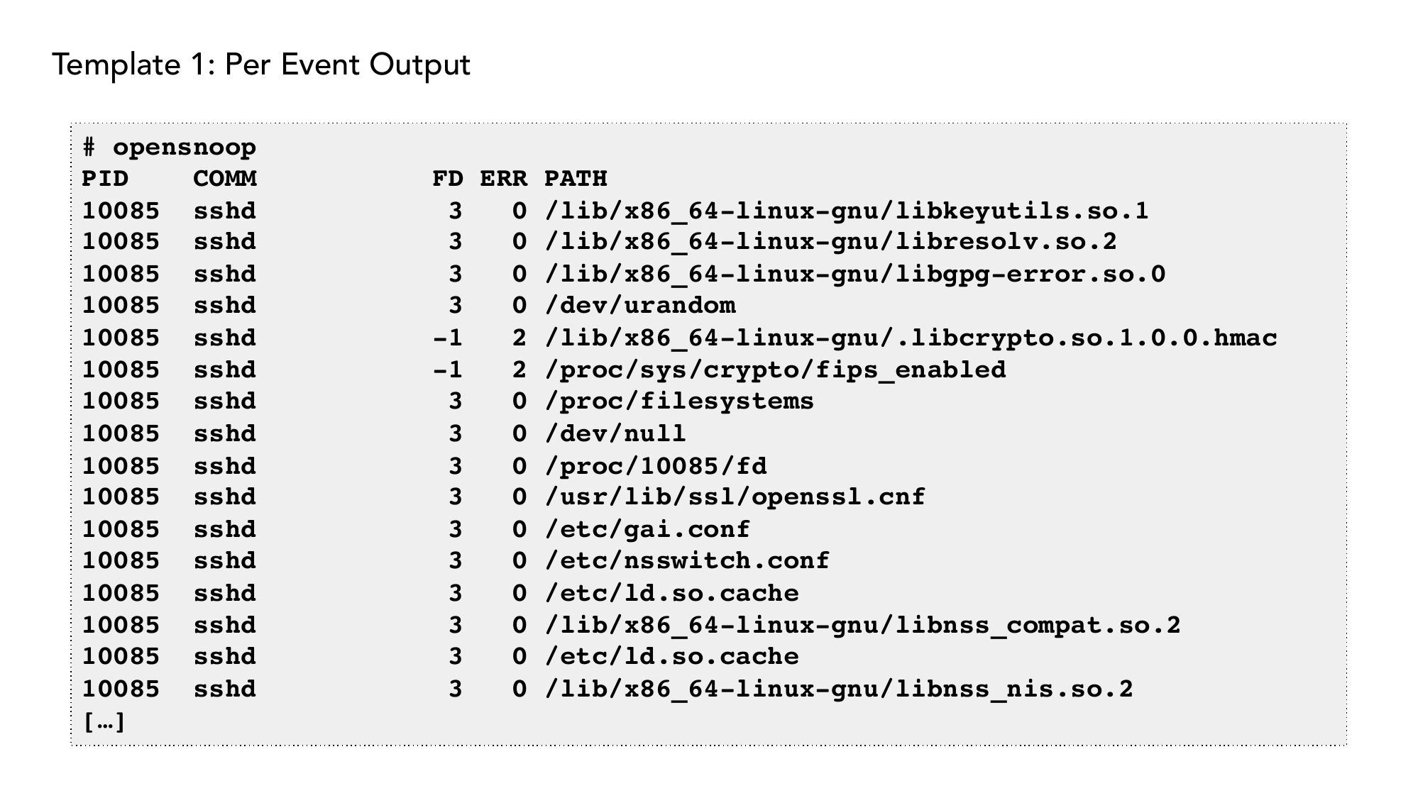 Template 1: Per Event Output # opensnoop PID COMM 10085 sshd 10085 sshd 10085 sshd 10085 sshd 10085 sshd 10085 sshd 10085 sshd 10085 sshd 10085 sshd 10085 sshd 10085 sshd 10085 sshd 10085 sshd 10085 sshd 10085 sshd 10085 sshd […] FD ERR PATH 0 /lib/x86_64-linux-gnu/libkeyutils.so.1 0 /lib/x86_64-linux-gnu/libresolv.so.2 0 /lib/x86_64-linux-gnu/libgpg-error.so.0 0 /dev/urandom 2 /lib/x86_64-linux-gnu/.libcrypto.so.1.0.0.hmac 2 /proc/sys/crypto/fips_enabled 0 /proc/filesystems 0 /dev/null 0 /proc/10085/fd 0 /usr/lib/ssl/openssl.cnf 0 /etc/gai.conf 0 /etc/nsswitch.conf 0 /etc/ld.so.cache 0 /lib/x86_64-linux-gnu/libnss_compat.so.2 0 /etc/ld.so.cache 0 /lib/x86_64-linux-gnu/libnss_nis.so.2slide 18:
