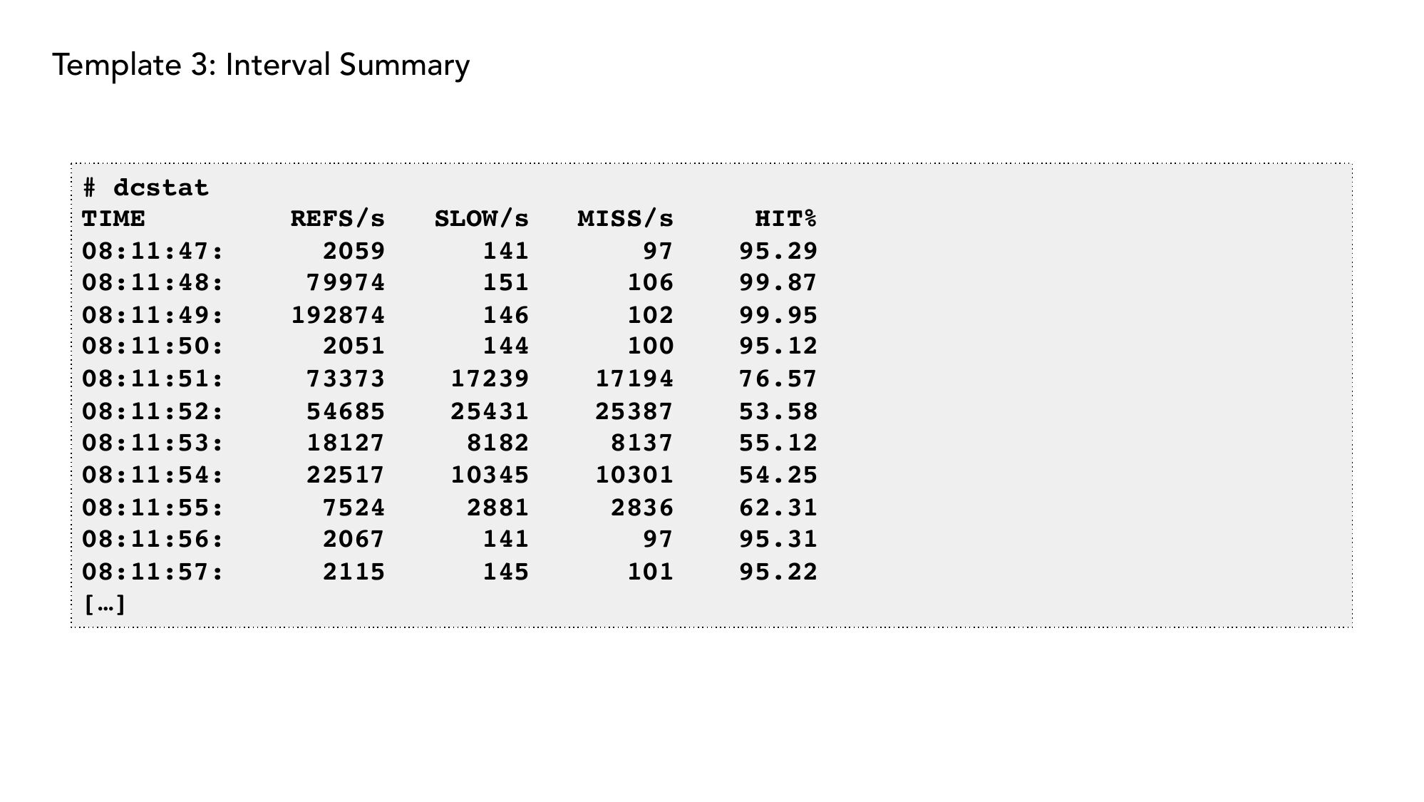 Template 3: Interval Summary # dcstat TIME 08:11:47: 08:11:48: 08:11:49: 08:11:50: 08:11:51: 08:11:52: 08:11:53: 08:11:54: 08:11:55: 08:11:56: 08:11:57: […] REFS/s SLOW/s MISS/s HIT%slide 20: