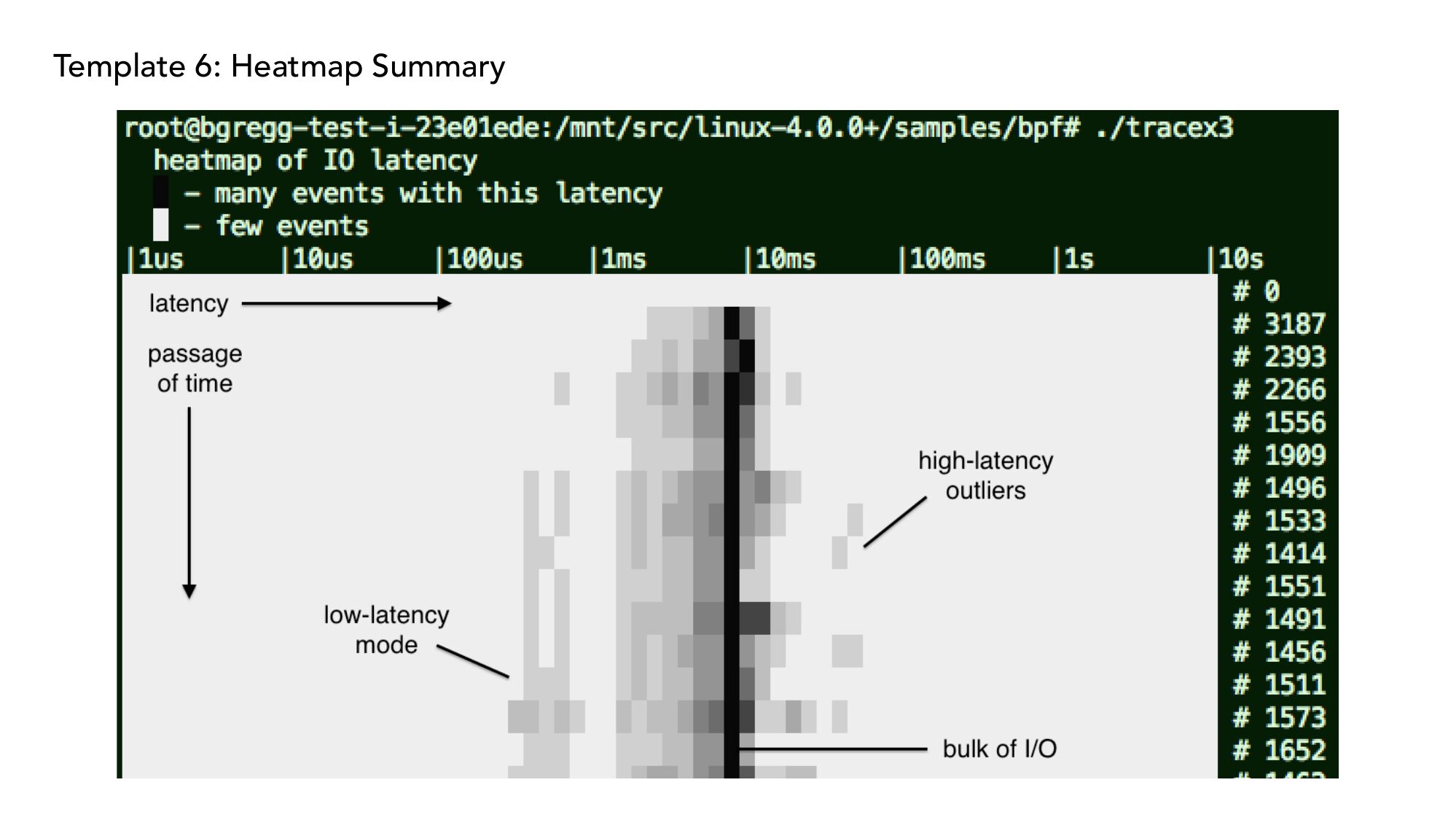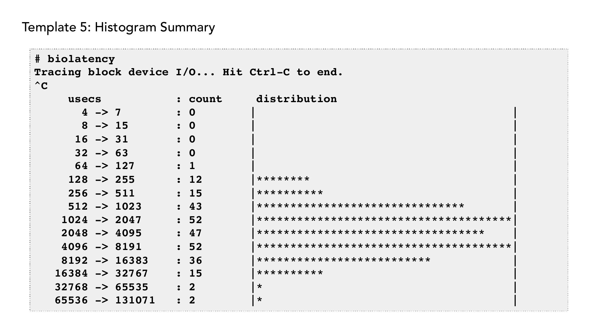 Template 5: Histogram Summary # biolatency Tracing block device I/O... Hit Ctrl-C to end. usecs : count distribution 4 ->gt; 7 : 0 8 ->gt; 15 : 0 16 ->gt; 31 : 0 32 ->gt; 63 : 0 64 ->gt; 127 : 1 128 ->gt; 255 : 12 |******** 256 ->gt; 511 : 15 |********** 512 ->gt; 1023 : 43 |******************************* 1024 ->gt; 2047 : 52 |**************************************| 2048 ->gt; 4095 : 47 |********************************** 4096 ->gt; 8191 : 52 |**************************************| 8192 ->gt; 16383 : 36 |************************** 16384 ->gt; 32767 : 15 |********** 32768 ->gt; 65535 : 2 65536 ->gt; 131071 : 2slide 22: