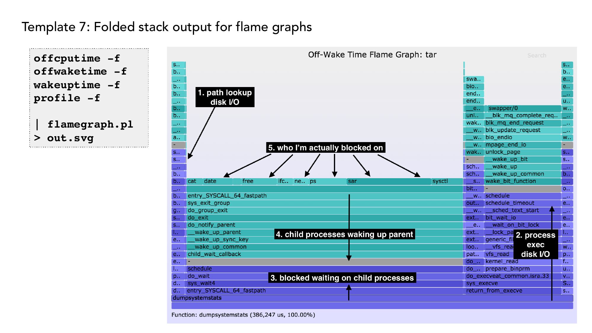 Template 7: Folded stack output for flame graphs offcputime -f offwaketime -f wakeuptime -f profile -f | flamegraph.pl >gt; out.svgslide 24: