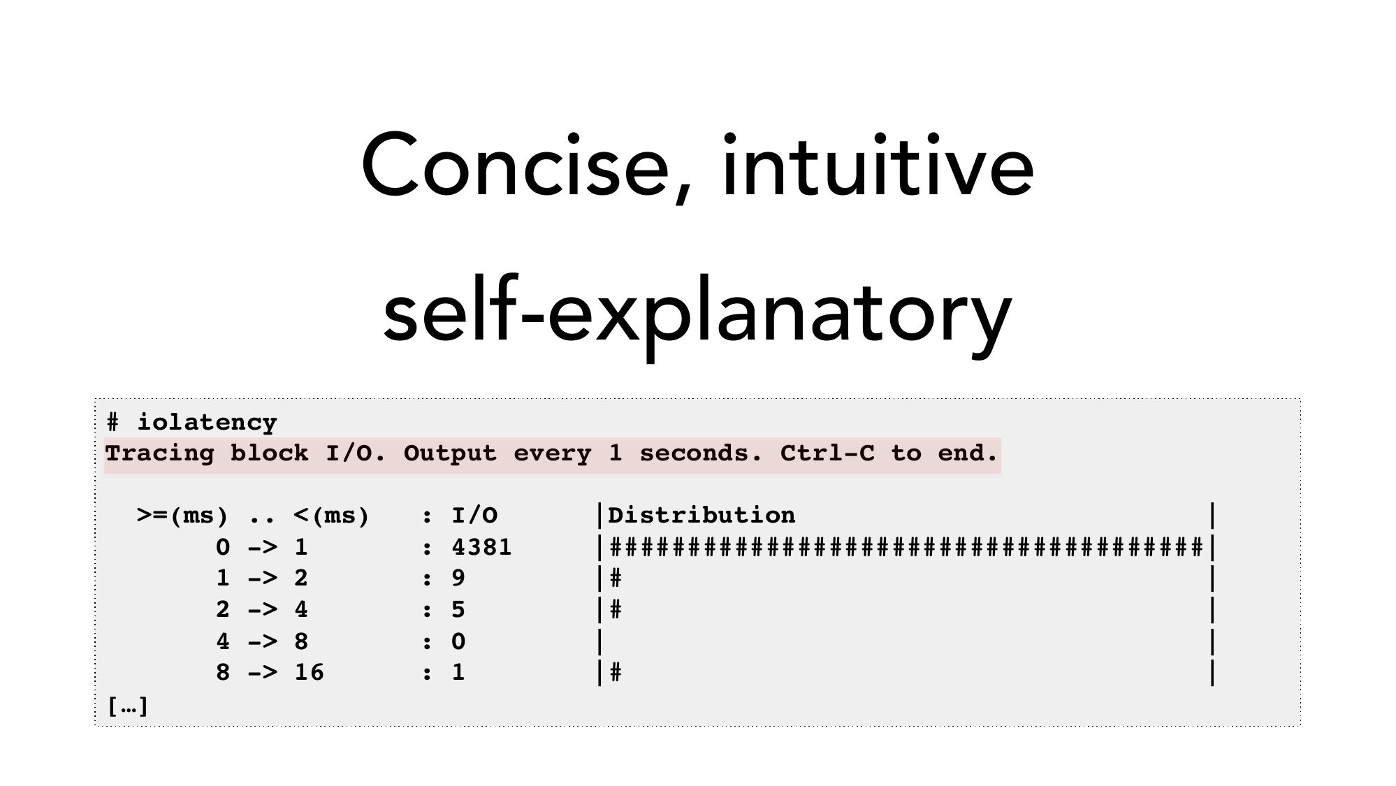 Concise, intuitive self-explanatory # iolatency Tracing block I/O. Output every 1 seconds. Ctrl-C to end. >gt;=(ms) ..slide 27:gt; 1 1 ->gt; 2 2 ->gt; 4 4 ->gt; 8 8 ->gt; 16 […] : I/O : 4381 : 9 : 5 : 0 : 1 |Distribution |######################################|