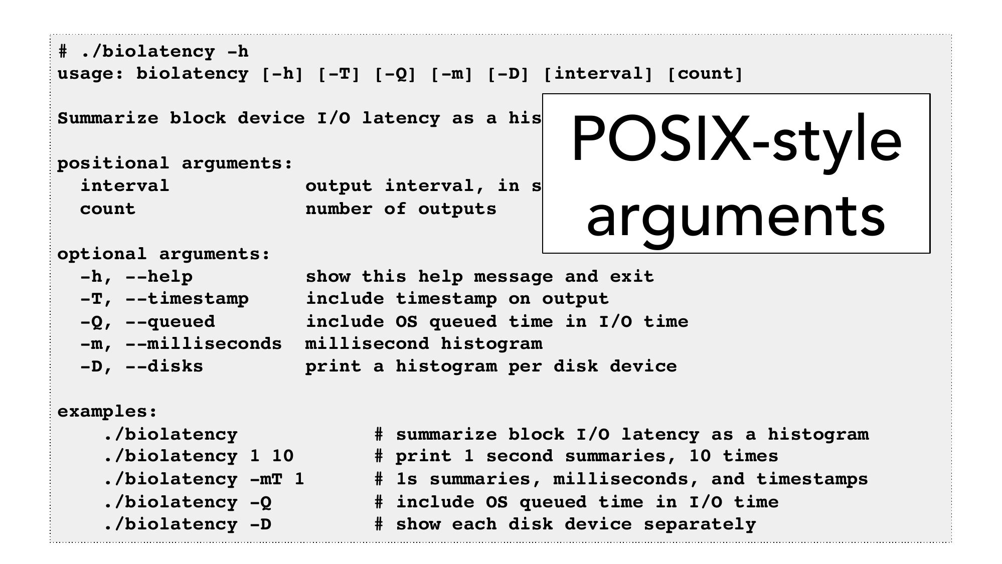 # ./biolatency -h usage: biolatency [-h] [-T] [-Q] [-m] [-D] [interval] [count] .POSIX-style. arguments Summarize block device I/O latency as a histogram positional arguments: interval output interval, in seconds count number of outputs optional arguments: -h, --help -T, --timestamp -Q, --queued -m, --milliseconds -D, --disks examples: ./biolatency ./biolatency 1 10 ./biolatency -mT 1 ./biolatency -Q ./biolatency -D show this help message and exit include timestamp on output include OS queued time in I/O time millisecond histogram print a histogram per disk device # summarize block I/O latency as a histogram # print 1 second summaries, 10 times # 1s summaries, milliseconds, and timestamps # include OS queued time in I/O time # show each disk device separatelyslide 28: