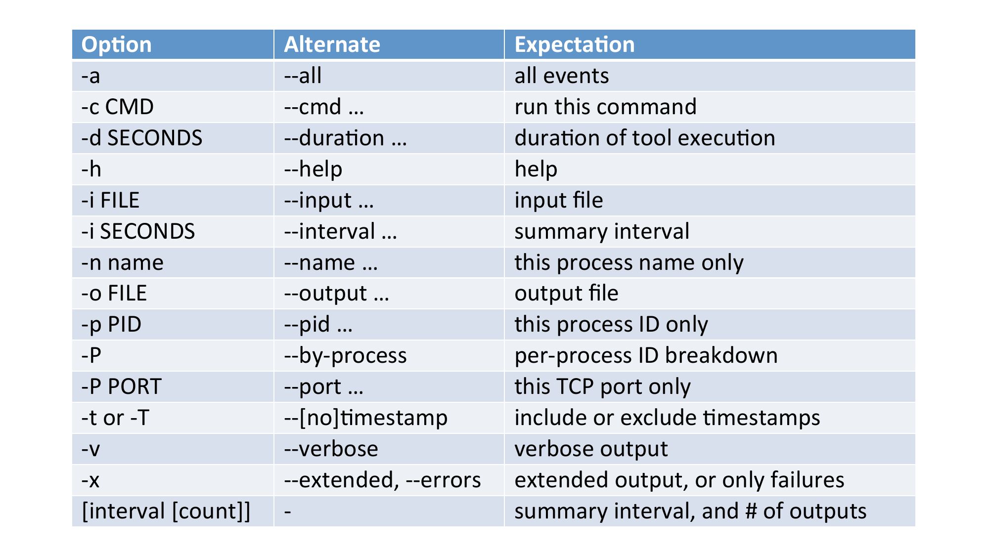 Op>gt;on -c CMD -d SECONDS -i FILE -i SECONDS -n name -o FILE -p PID -P PORT -t or -T [interval [count]] Alternate --all --cmd … --duraAon … --help --input … --interval … --name … --output … --pid … --by-process --port … --[no]Amestamp --verbose --extended, --errors Expecta>gt;on all events run this command duraAon of tool execuAon help input file summary interval this process name only output file this process ID only per-process ID breakdown this TCP port only include or exclude Amestamps verbose output extended output, or only failures summary interval, and # of outputsslide 29: