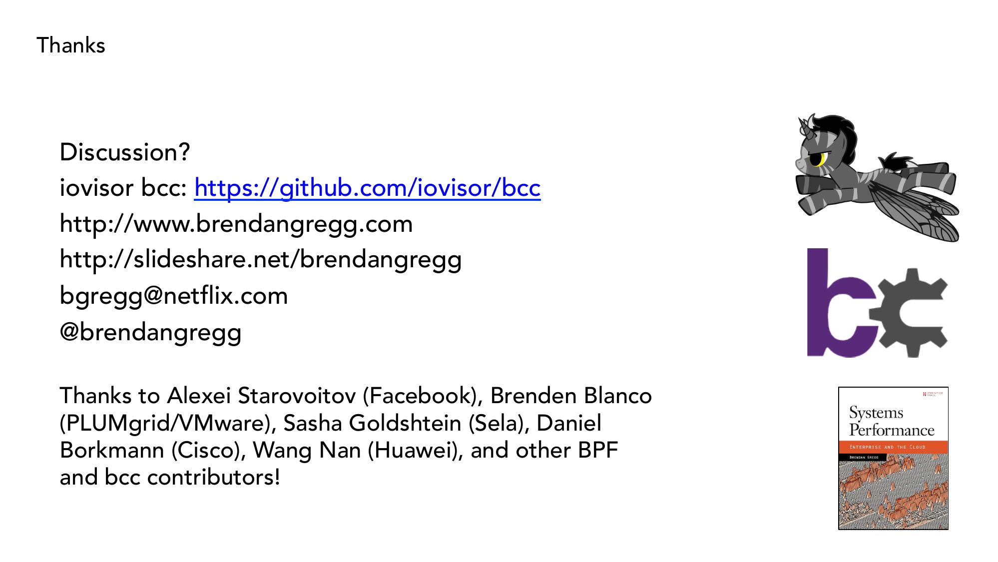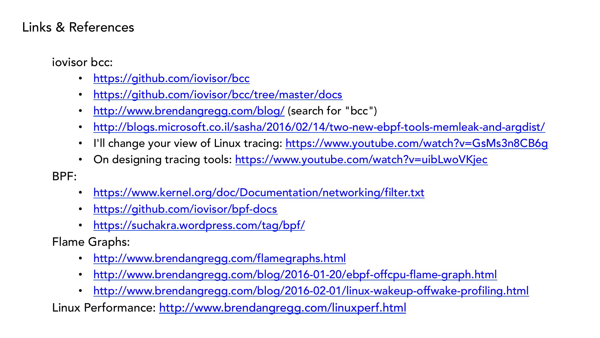 Slides from a discussion at the IOVisor (eBPF) workshop in Feb 2017 led by Brendan Gregg, about BPF performance and observability tools.| next prev 1/44 | |
