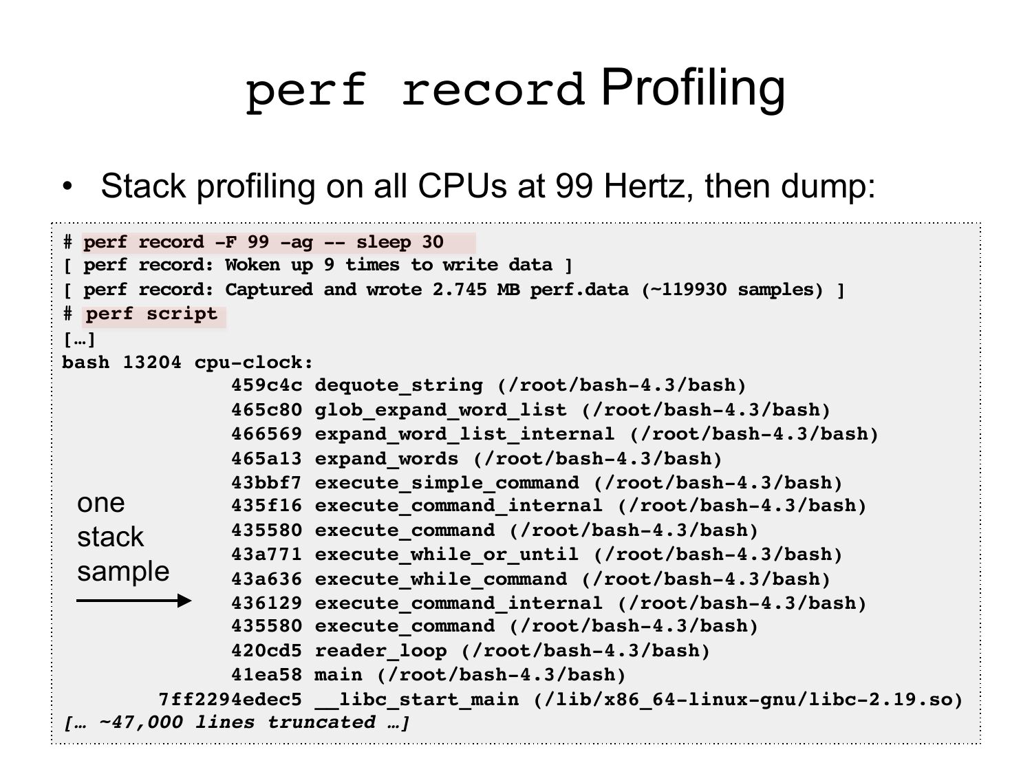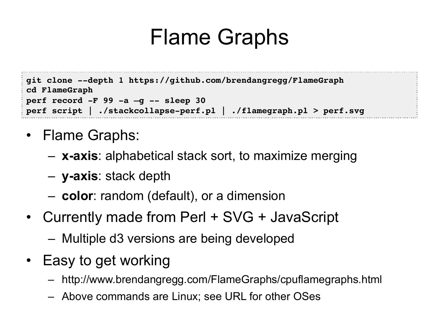 Why we need CPU profiling • Improving performance • Cost savings – ASGs often scale on load average (CPU), so CPU usage is proportional to cost Auto Scaling Group Scaling Policy CloudWatch, Servo – Identify tuning targets – Incident response – Non-regression testing – Software evaluations – CPU workload characterization loadavg, latency, … Instance Instance Instanceslide 10: