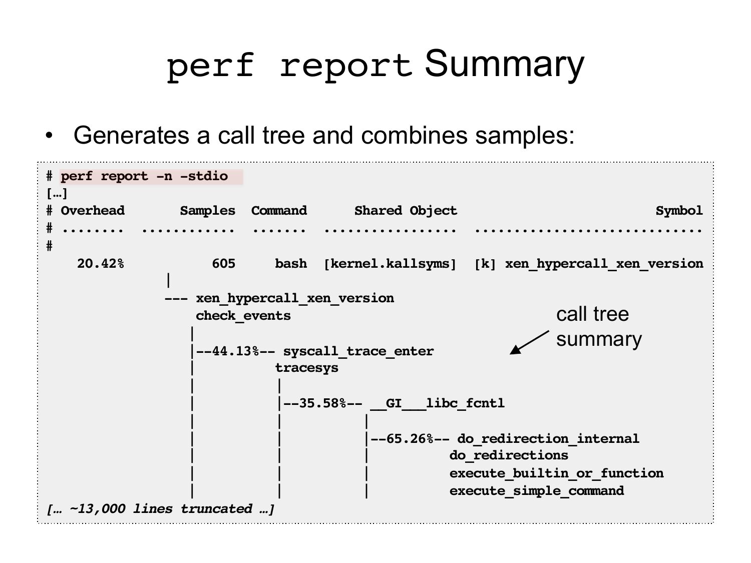 Solution • Fix system profiling – Only way to see it all Kernel • Visibility is everything: – Java methods – JVM (C++) – GC (C++) – libraries (C) – kernel (C) Java JVM • Minor Problems: – 0-3% CPU overhead to enable frame pointers (usuallyslide 18: Simple Production Example 1. Poor performance, and one CPU at 100% 2. perf_events flame graph shows JVM stuck compilingslide 19:Another System Example Exception handling consuming CPUslide 20:DEMO FlameGraph_tomcat01.svgslide 21:Exonerating The System • From last week: - Frequent thread creation/ destruction assumed to be consuming CPU resources. Recode application? - A flame graph quantified this CPU time: near zero - Time mostly other Java methodsslide 22:Profiling GC GC internals, visualized:slide 23:CPU Profilingslide 24:CPU Profiling • Record stacks at a timed interval: simple and effective – Pros: Low (deterministic) overhead – Cons: Coarse accuracy, but usually sufficient stack samples: syscall on-CPU time off-CPU block interruptslide 25:Stack Traces • A code path snapshot. e.g., from jstack(1): $ jstack 1819 […] "main" prio=10 tid=0x00007ff304009000 nid=0x7361 runnable [0x00007ff30d4f9000] java.lang.Thread.State: RUNNABLE running at Func_abc.func_c(Func_abc.java:6) codepath at Func_abc.func_b(Func_abc.java:16) start at Func_abc.func_a(Func_abc.java:23) at Func_abc.main(Func_abc.java:27) running parent g.parent g.g.parenslide 26:System Profilers • Linux – perf_events (aka "perf") • Oracle Solaris – DTrace • OS X – Instruments • Windows – XPerf • And many others…slide 27:Linux perf_events • Standard Linux profiler – Provides the perf command (multi-tool) – Usually pkg added by linux-tools-common, etc. • Features: – Timer-based sampling – Hardware events – Tracepoints – Dynamic tracing • Can sample stacks of (almost) everything on CPU – Can miss hard interrupt ISRs, but these should be near-zero. They can be measured if needed (I wrote my own tools)slide 28:perf record Profiling • Stack profiling on all CPUs at 99 Hertz, then dump: # perf record -F 99 -ag -- sleep 30 [ perf record: Woken up 9 times to write data ] [ perf record: Captured and wrote 2.745 MB perf.data (~119930 samples) ] # perf script […] bash 13204 cpu-clock: 459c4c dequote_string (/root/bash-4.3/bash) 465c80 glob_expand_word_list (/root/bash-4.3/bash) 466569 expand_word_list_internal (/root/bash-4.3/bash) 465a13 expand_words (/root/bash-4.3/bash) 43bbf7 execute_simple_command (/root/bash-4.3/bash) 435f16 execute_command_internal (/root/bash-4.3/bash) one 435580 execute_command (/root/bash-4.3/bash) stack 43a771 execute_while_or_until (/root/bash-4.3/bash) sample 43a636 execute_while_command (/root/bash-4.3/bash) 436129 execute_command_internal (/root/bash-4.3/bash) 435580 execute_command (/root/bash-4.3/bash) 420cd5 reader_loop (/root/bash-4.3/bash) 41ea58 main (/root/bash-4.3/bash) 7ff2294edec5 __libc_start_main (/lib/x86_64-linux-gnu/libc-2.19.so) [… ~47,000 lines truncated …]slide 29:perf report Summary • Generates a call tree and combines samples: # perf report -n -stdio […] # Overhead Samples Command Shared Object Symbol # ........ ............ ....... ................. ............................. 20.42% bash [kernel.kallsyms] [k] xen_hypercall_xen_version --- xen_hypercall_xen_version check_events call tree summary |--44.13%-- syscall_trace_enter tracesys |--35.58%-- __GI___libc_fcntl |--65.26%-- do_redirection_internal do_redirections execute_builtin_or_function execute_simple_command [… ~13,000 lines truncated …]slide 30:Flame Graphsslide 31:perf report Verbosity • Despite summarizing, output is still verbose # perf report -n -stdio […] # Overhead Samples Command Shared Object Symbol # ........ ............ ....... ................. ............................. 20.42% bash [kernel.kallsyms] [k] xen_hypercall_xen_version --- xen_hypercall_xen_version check_events |--44.13%-- syscall_trace_enter tracesys |--35.58%-- __GI___libc_fcntl |--65.26%-- do_redirection_internal do_redirections execute_builtin_or_function execute_simple_command [… ~13,000 lines truncated …]slide 32:Full perf report Outputslide 33:… as a Flame Graphslide 34:Flame Graphs git clone --depth 1 https://github.com/brendangregg/FlameGraph cd FlameGraph perf record -F 99 -a –g -- sleep 30 perf script | ./stackcollapse-perf.pl | ./flamegraph.pl >gt; perf.svg • Flame Graphs: – x-axis: alphabetical stack sort, to maximize merging – y-axis: stack depth – color: random (default), or a dimension • Currently made from Perl + SVG + JavaScript – Multiple d3 versions are being developed • Easy to get working – http://www.brendangregg.com/FlameGraphs/cpuflamegraphs.html – Above commands are Linux; see URL for other OSesslide 35:Linux perf_events Workflow list events count events capture stacks perf list perf stat perf record Typical Workflow perf.data text UI dump profile perf report flame graph visualization perf script stackcollapse-perf.pl flamegraph.plslide 36:Flame Graph Interpretation g() e() f() d() c() i() b() h() a()slide 37:Flame Graph Interpretation (1/3) Top edge shows who is running on-CPU, and how much (width) g() e() f() d() c() i() b() h() a()slide 38:Flame Graph Interpretation (2/3) Top-down shows ancestry e.g., from g(): g() e() f() d() c() i() b() h() a()slide 39:Flame Graph Interpretation (3/3) Widths are proportional to presence in samples e.g., comparing b() to h() (incl. children) g() e() f() d() c() i() b() h() a()slide 40:Flame Graph Colors • Randomized by default • Can be used as a dimension. e.g.: – Mixed-mode flame graphs – Differential flame graphs – Searchslide 41:Mixed-Mode Flame Graphs • Hues: – green == Java – red == system – yellow == C++ • Intensity randomized to differentiate frames – Or hashed based on function name Mixed-Mode Kernel Java JVMslide 42:Differential Flame Graphs • Hues: Differential – red == more samples – blue == l