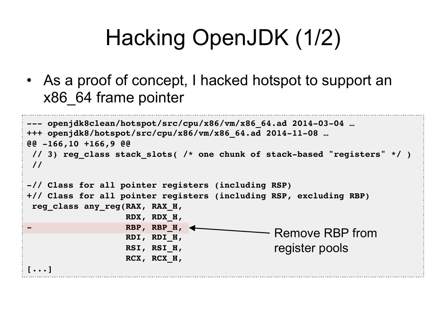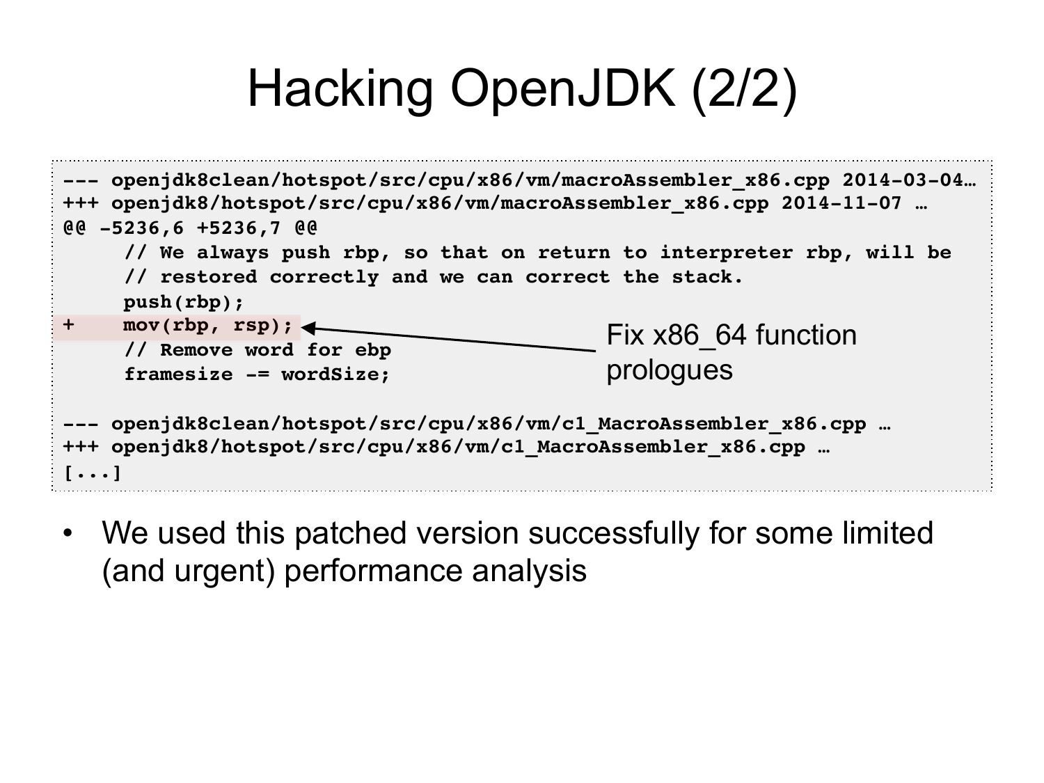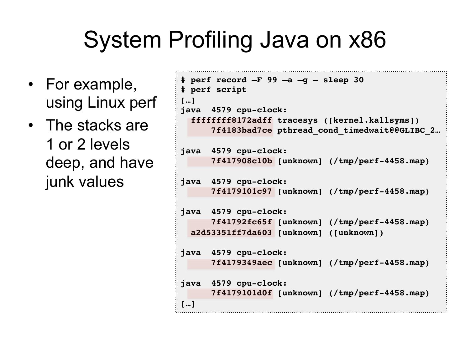 System Profilers • Visibility – JVM (C++) – GC (C++) – libraries (C) – kernel (C) • Typical problems (x86): – Stacks missing for Java – Symbols missing for Java methods • Other architectures (e.g., SPARC) have fared better • Profile everything except Javaslide 15: