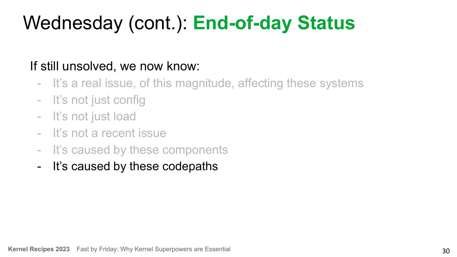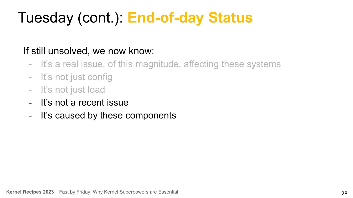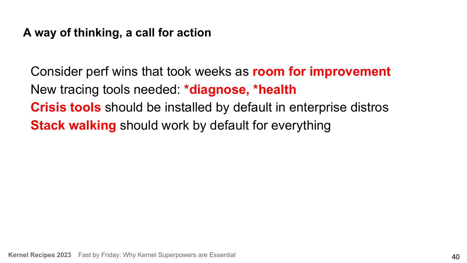 Description: "It is not ok that we speed weeks, even months, trying to solve why software is slow. Companies waste money on compute costs, users are unhappy with latency, and product evaluations run out of investigation time. It should not take more than a week to identify the root cause or causes for a performance issue, such that any performance issue reported on a Monday should be solved by Friday, or sooner. The kernel superpowers we have been building are essential for this dream, and allow us to explore performance analysis methodologies to achieve this that were previously a fantasy.