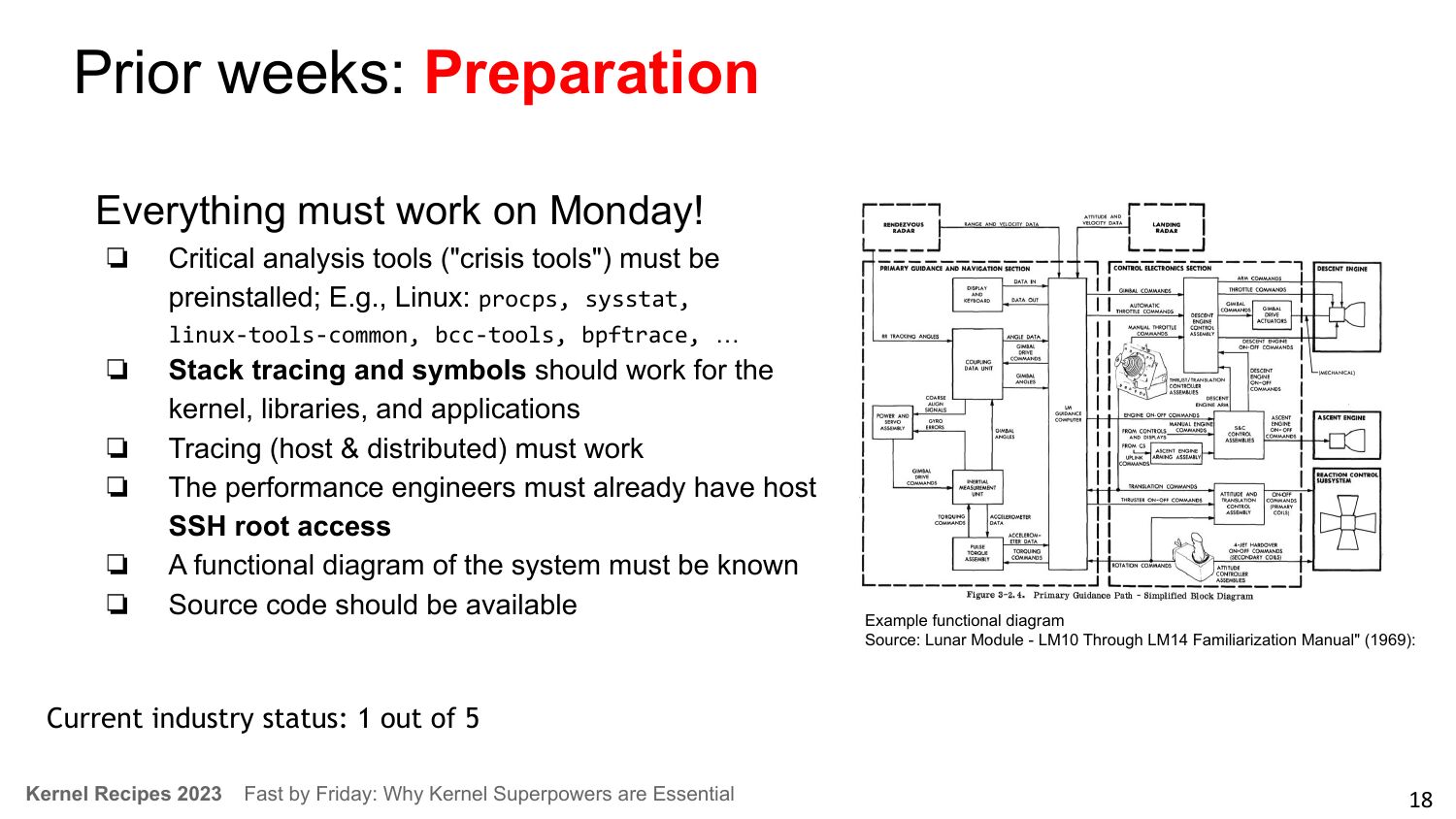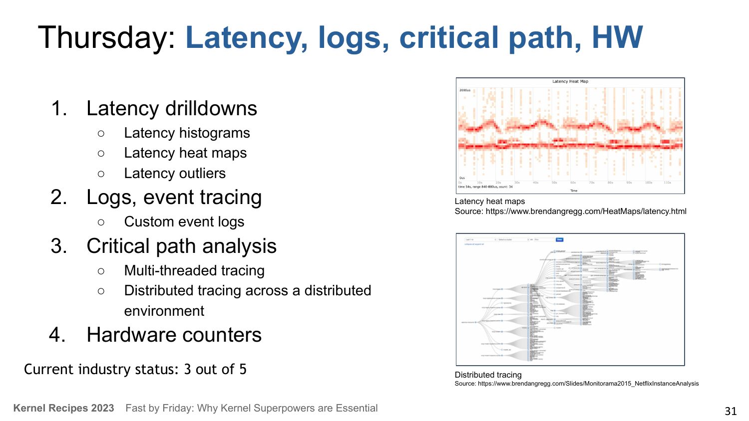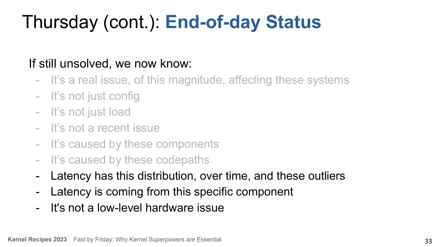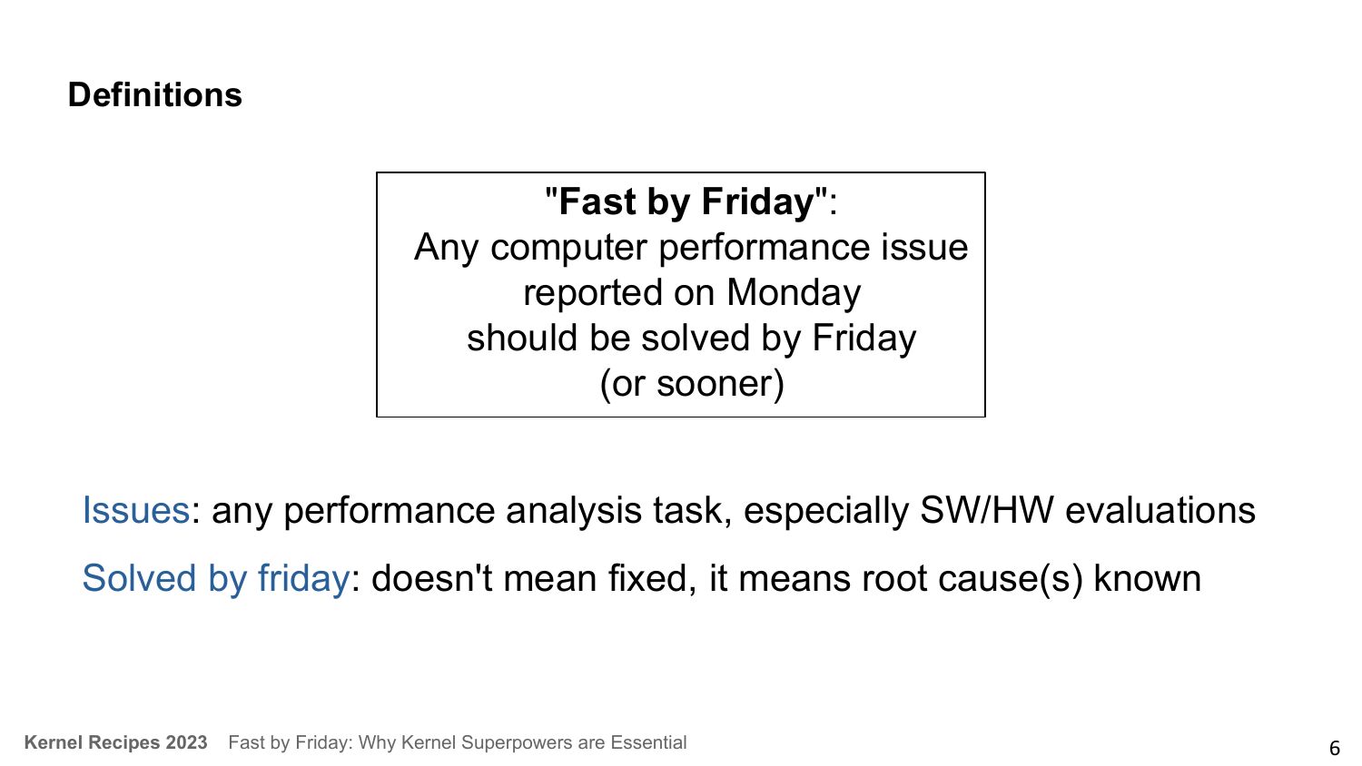 Description: "It is not ok that we speed weeks, even months, trying to solve why software is slow. Companies waste money on compute costs, users are unhappy with latency, and product evaluations run out of investigation time. It should not take more than a week to identify the root cause or causes for a performance issue, such that any performance issue reported on a Monday should be solved by Friday, or sooner. The kernel superpowers we have been building are essential for this dream, and allow us to explore performance analysis methodologies to achieve this that were previously a fantasy.
