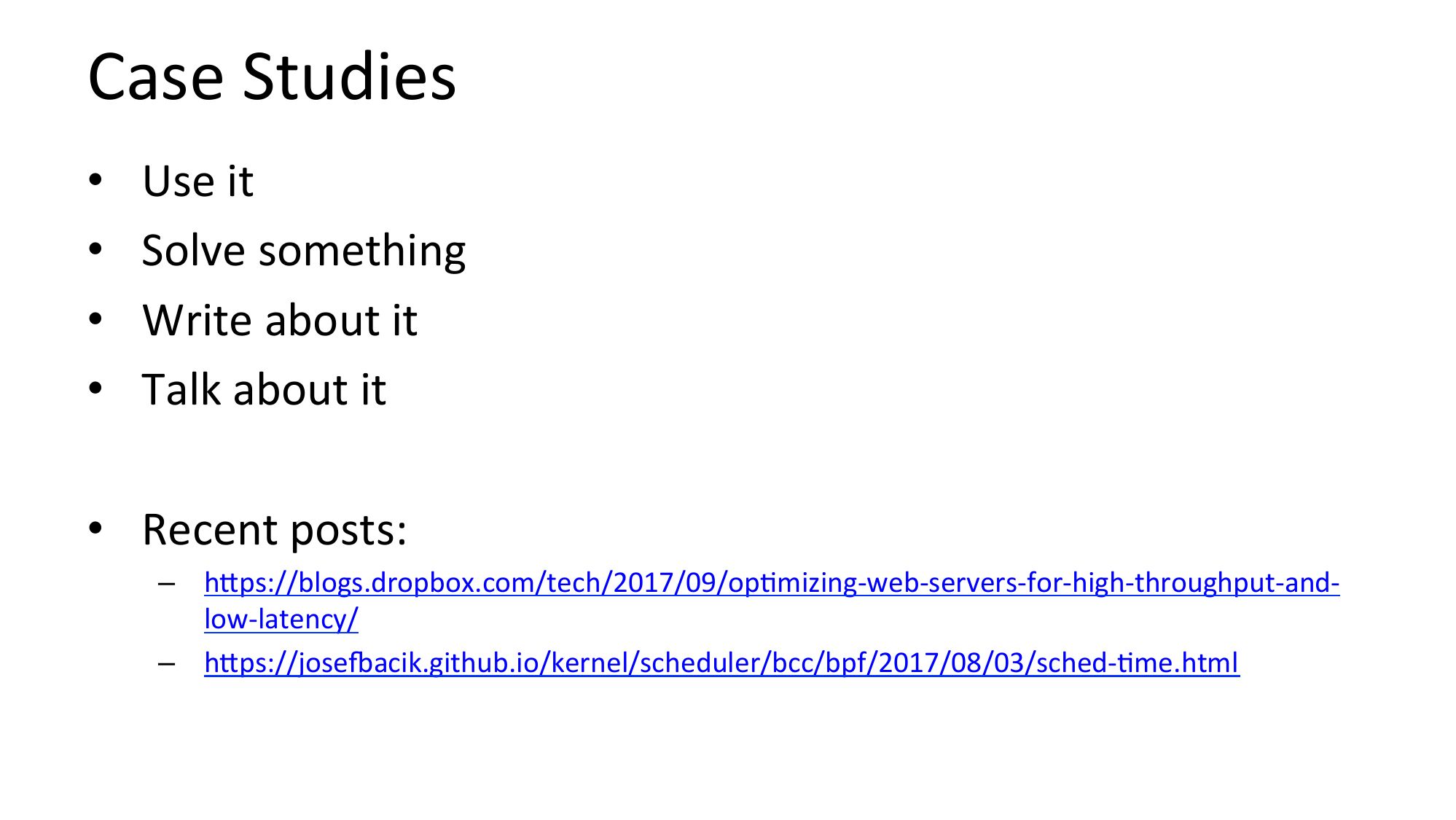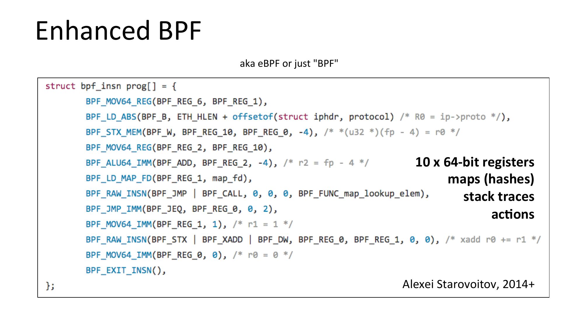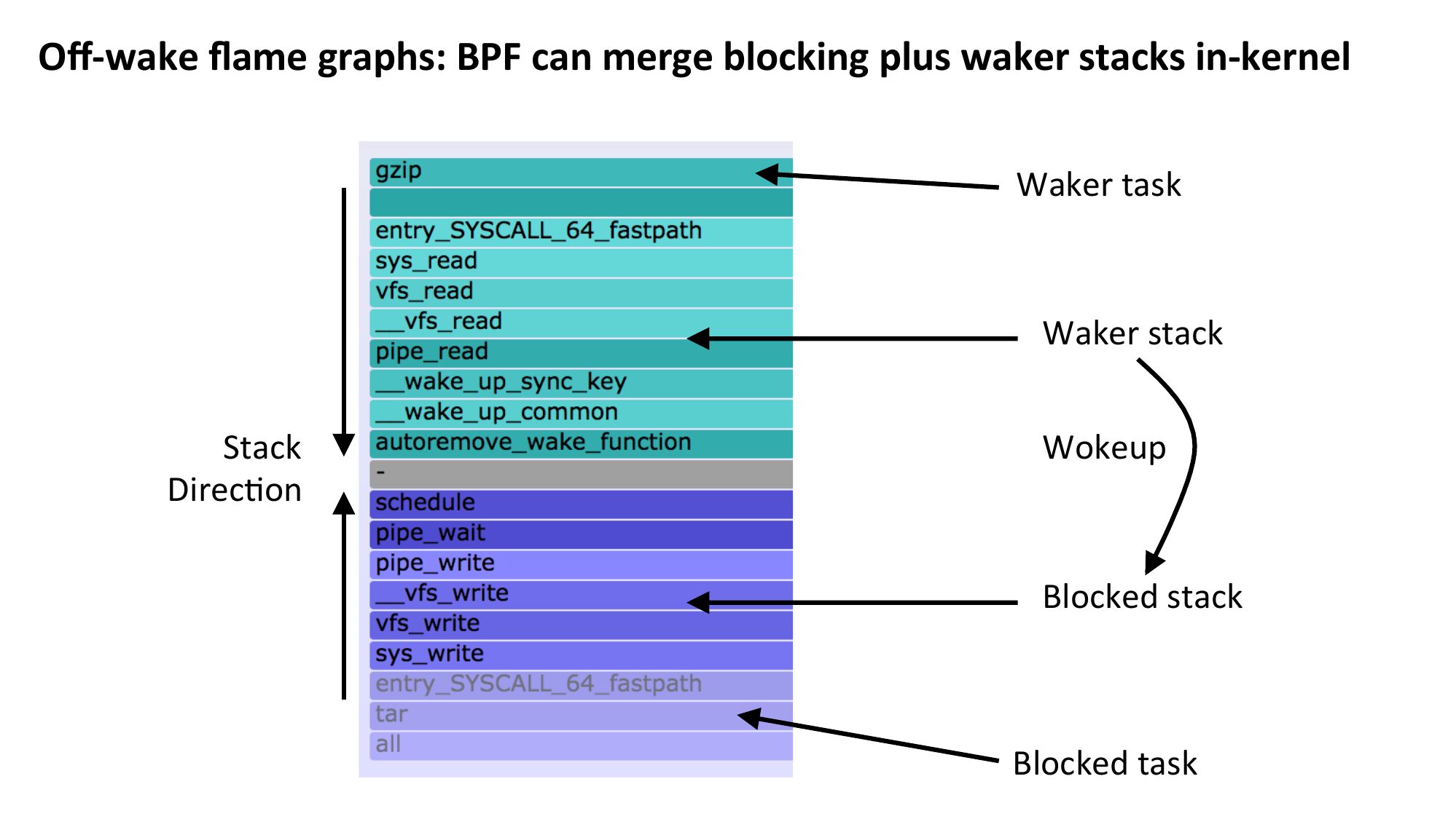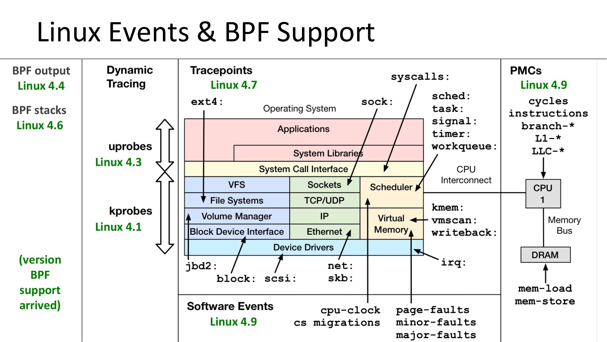 Beginning with the bpf() syscall in 3.18, enhancements have been added in many kernel versions since, with major features for BPF analysis landing in Linux 4.1, 4.4, 4.7, and 4.9. Specific capabilities these provide include custom in-kernel summaries of metrics, custom latency measurements, and frequency counting kernel and user stack traces on events. One interesting case involves saving stack traces on wake up events, and associating them with the blocked stack trace: so that we can see the blocking stack trace and the waker together, merged in kernel by a BPF program (that particular example is in the kernel as samples/bpf/offwaketime).