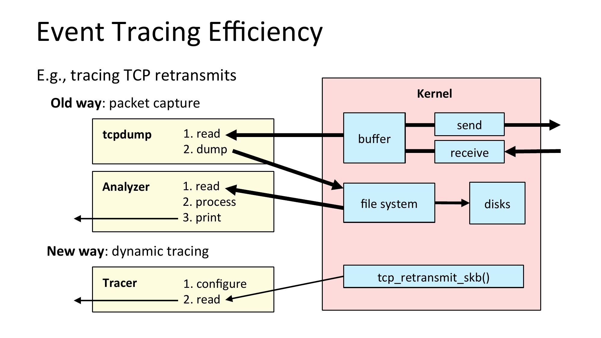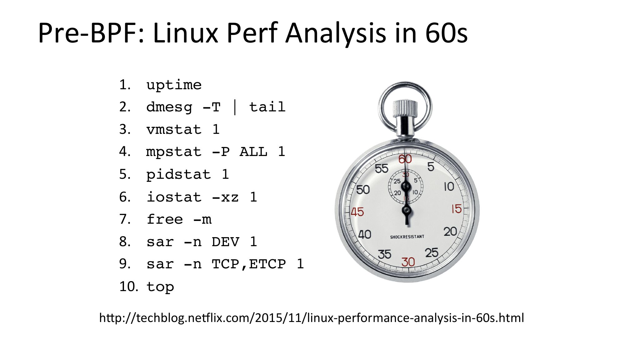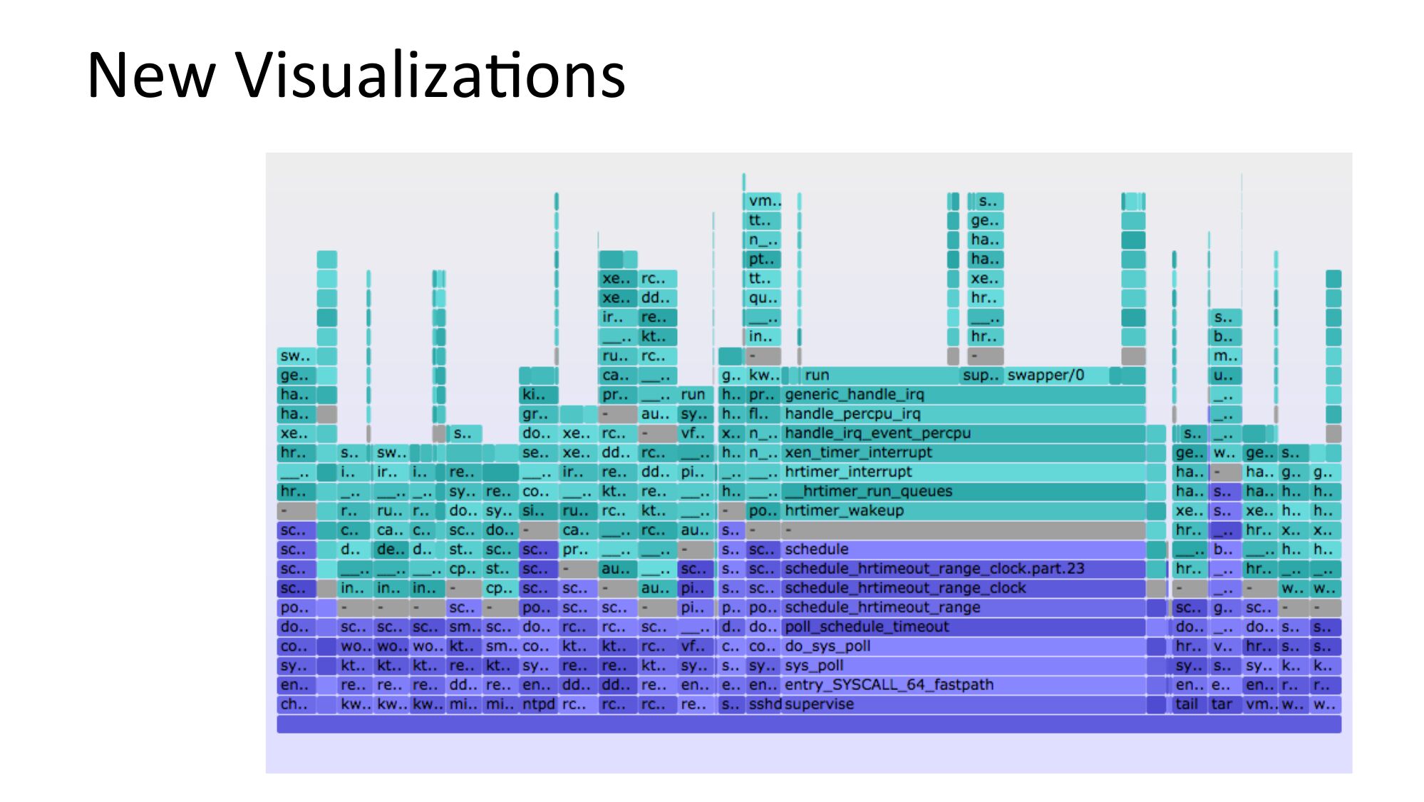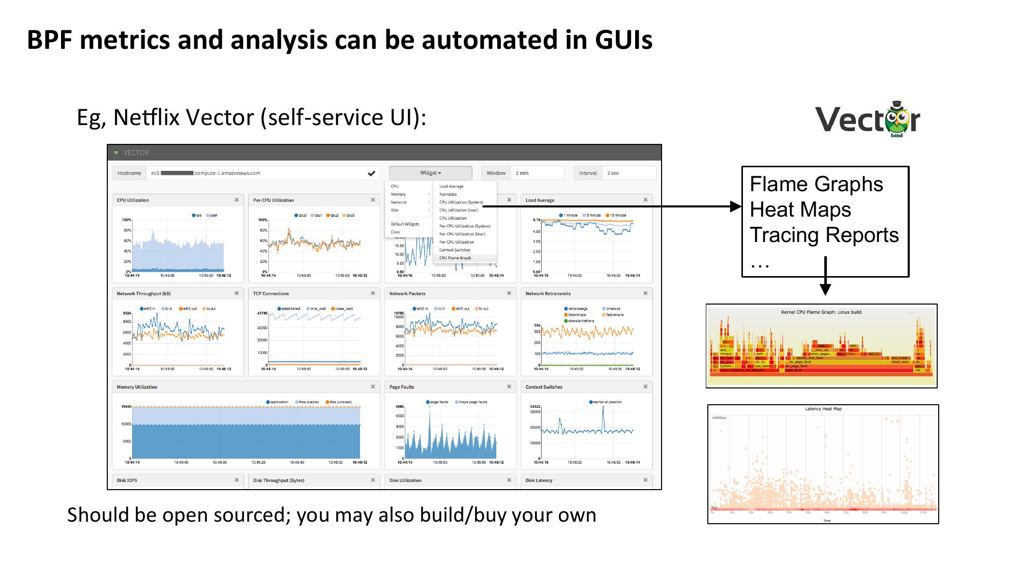 Beginning with the bpf() syscall in 3.18, enhancements have been added in many kernel versions since, with major features for BPF analysis landing in Linux 4.1, 4.4, 4.7, and 4.9. Specific capabilities these provide include custom in-kernel summaries of metrics, custom latency measurements, and frequency counting kernel and user stack traces on events. One interesting case involves saving stack traces on wake up events, and associating them with the blocked stack trace: so that we can see the blocking stack trace and the waker together, merged in kernel by a BPF program (that particular example is in the kernel as samples/bpf/offwaketime).