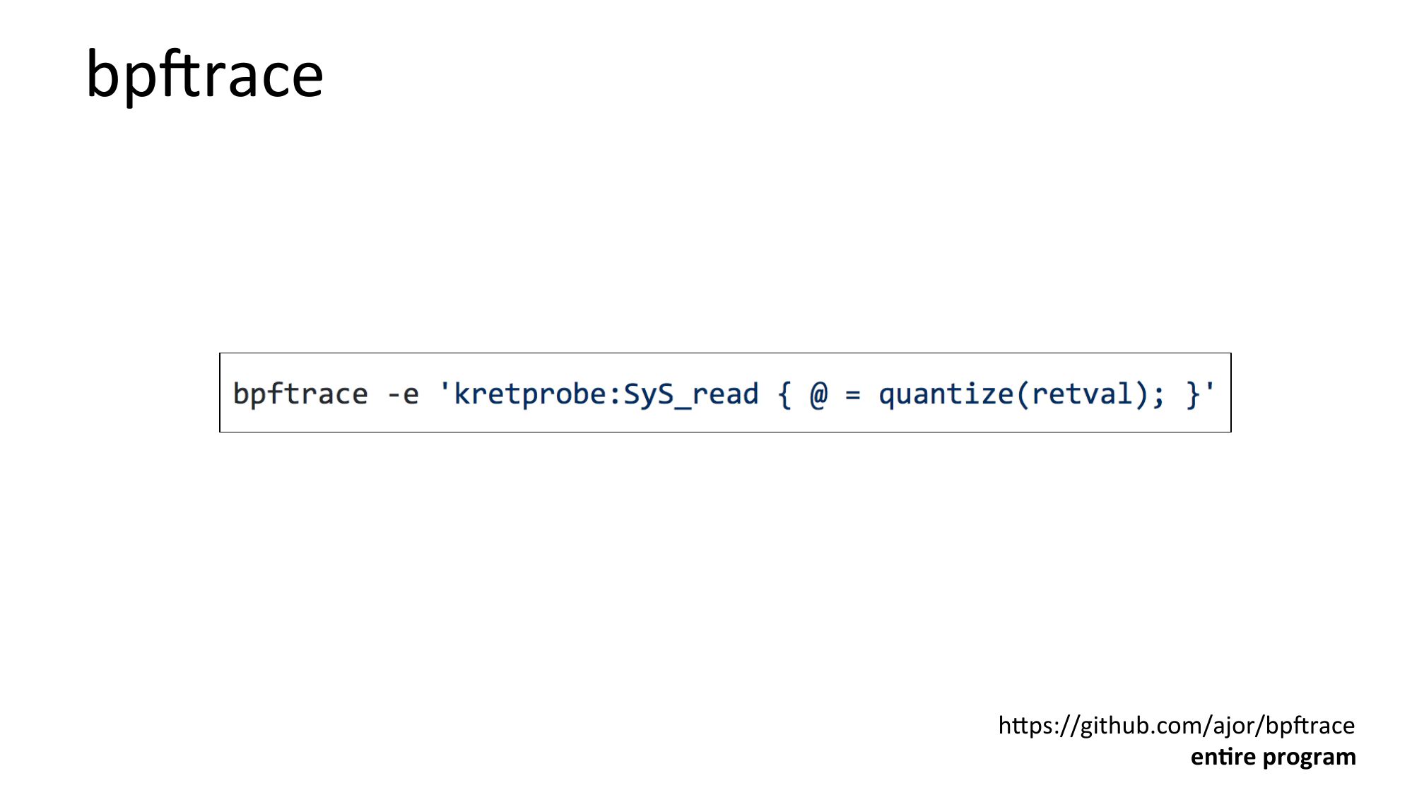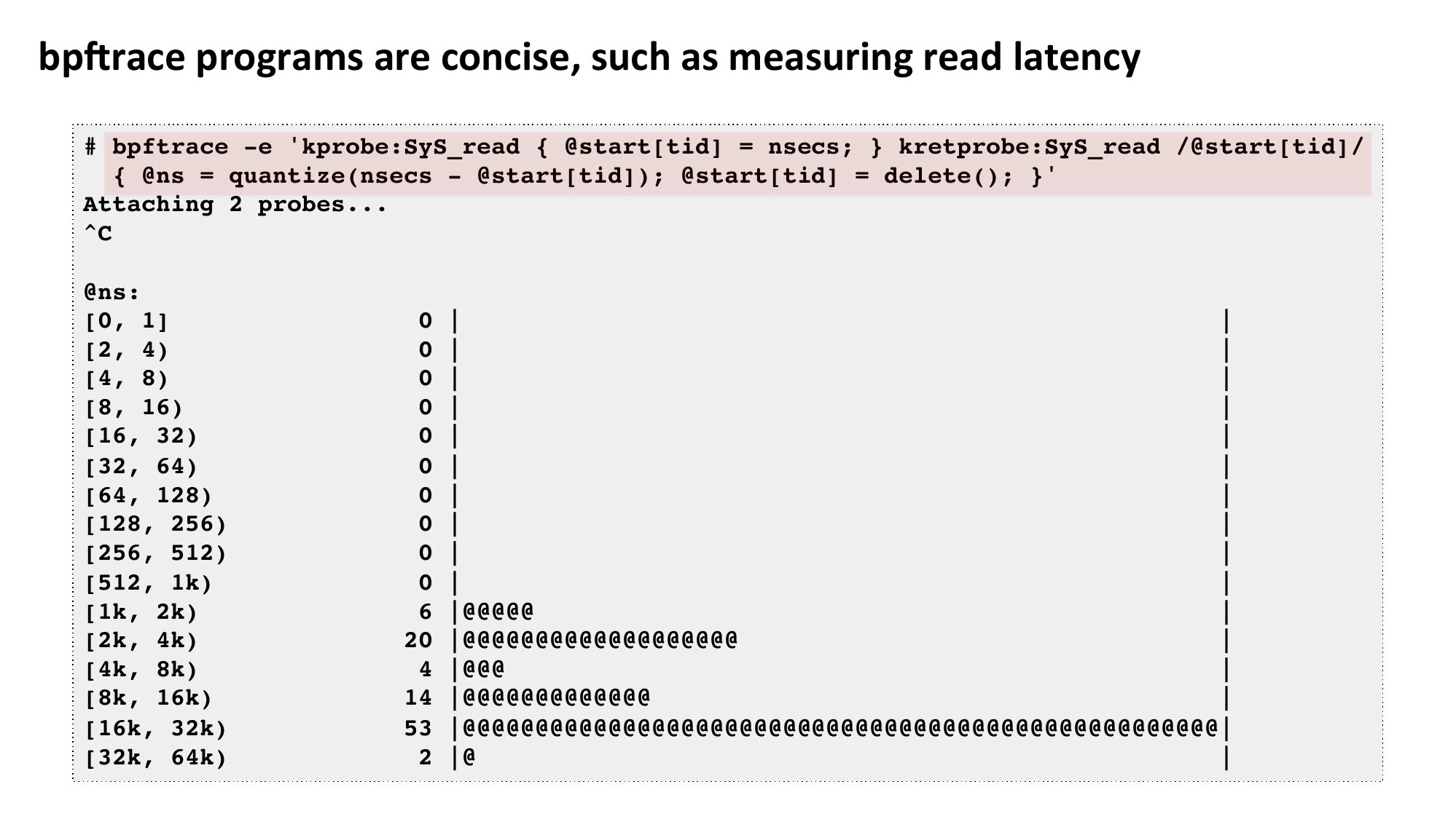 # bpftrace -e 'kprobe:SyS_read { @start[tid] = nsecs; } kretprobe:SyS_read /@start[tid]/