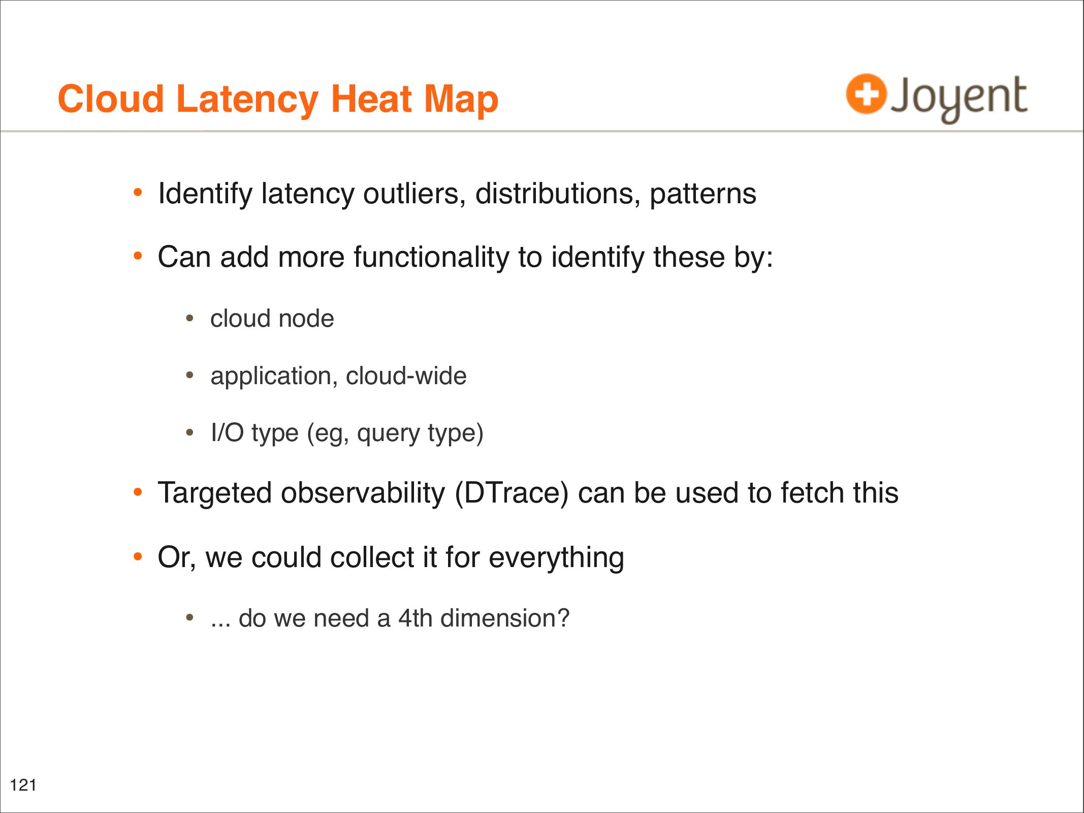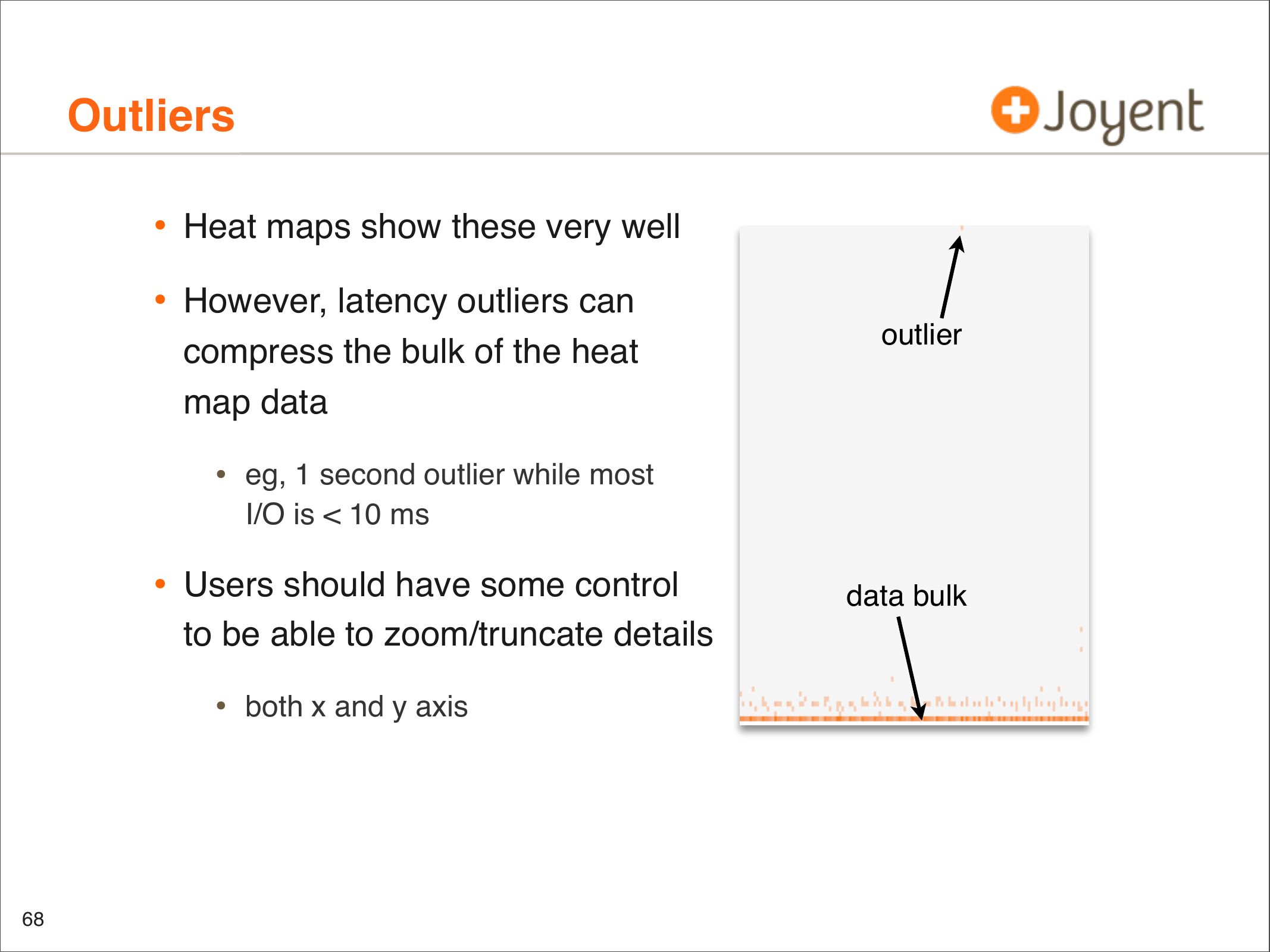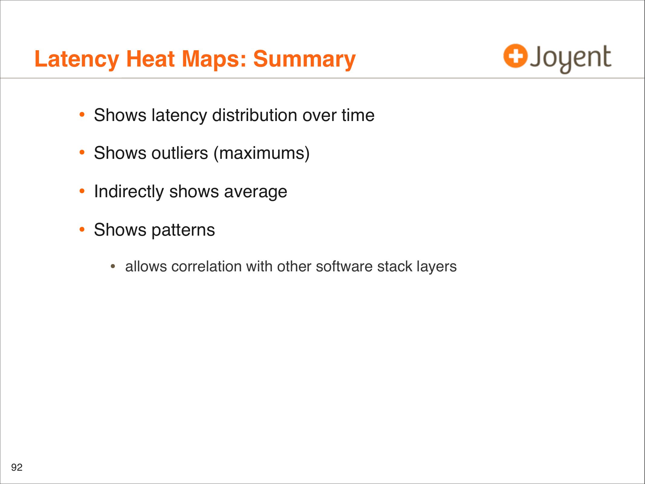 • Identify latency outliers, distributions, patterns