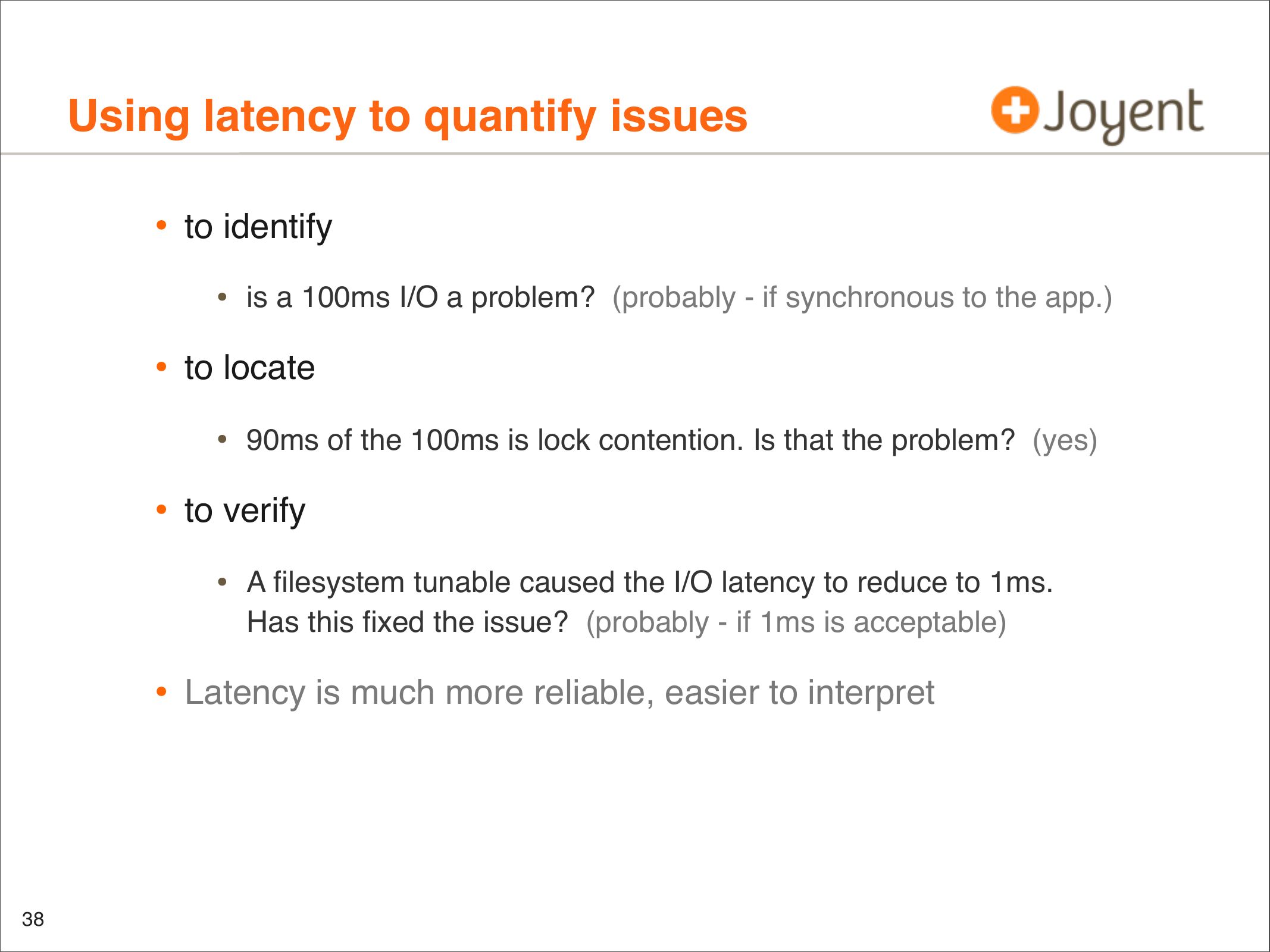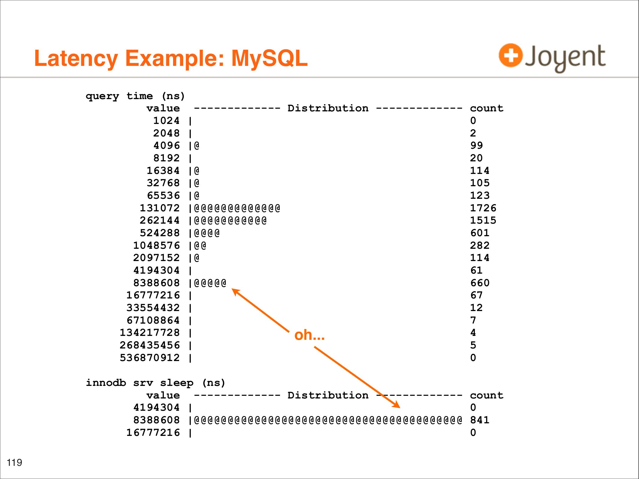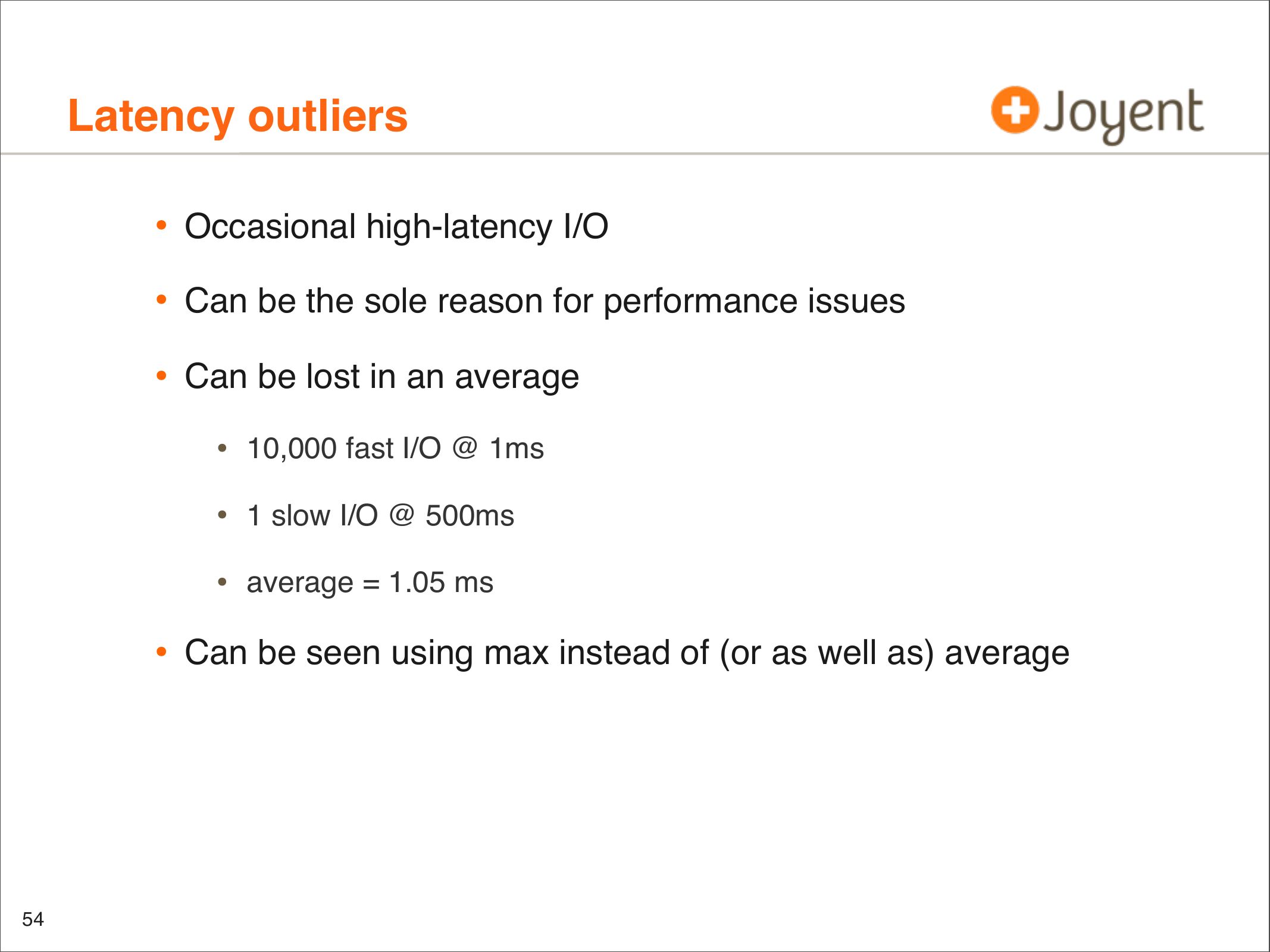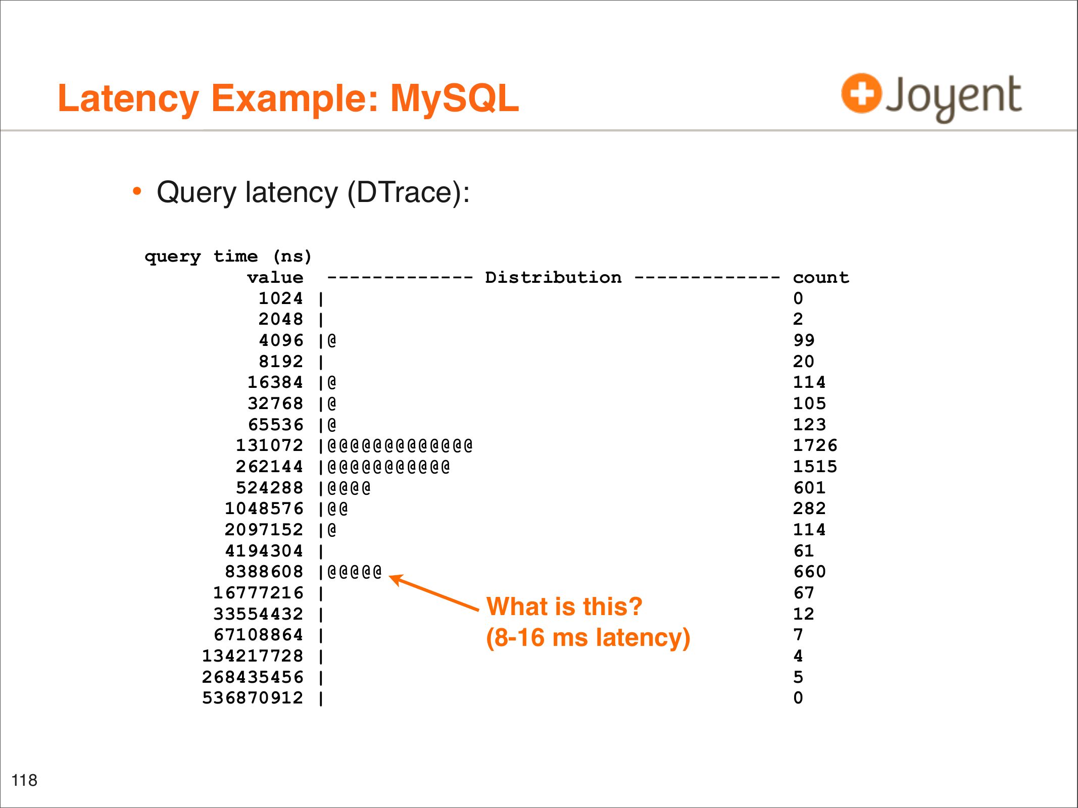 • Identify latency outliers, distributions, patterns