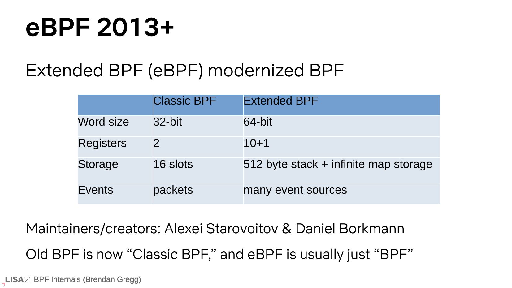 eBPF 2013+ Extended BPF (eBPF) modernized BPF Classic BPF Extended BPF Word size 32-bit 64-bit Registers 10+1 Storage 16 slots 512 byte stack + infinite map storage Events packets many event sources Maintainers/creators: Alexei Starovoitov & Daniel Borkmann Old BPF is now “Classic BPF,” and eBPF is usually just “BPF” BPF Internals (Brendan Gregg)slide 7: