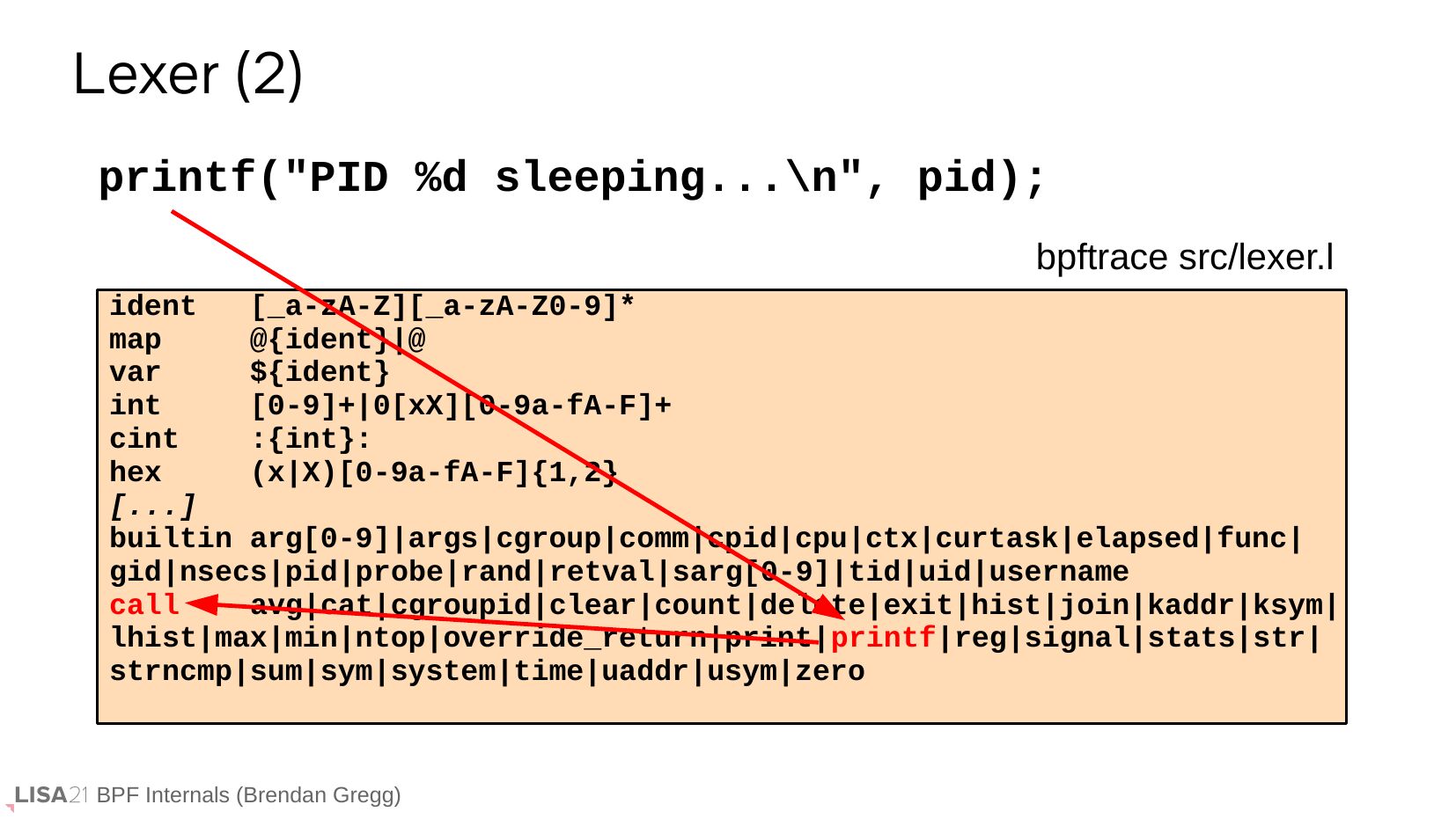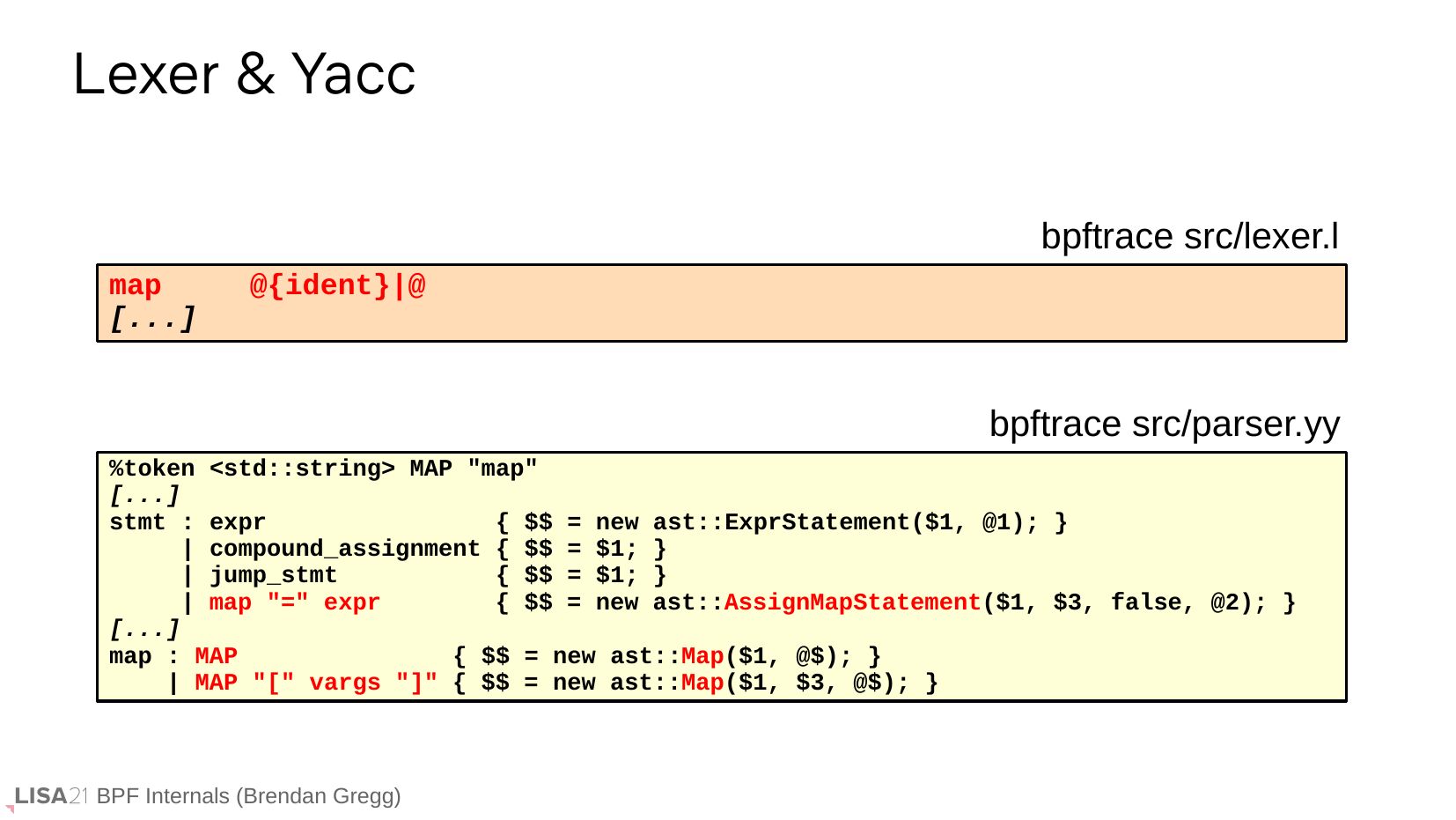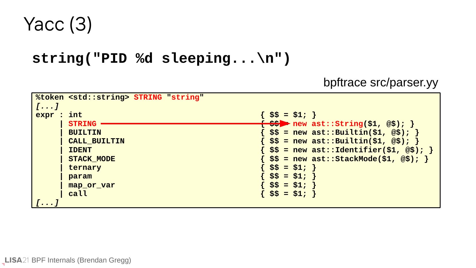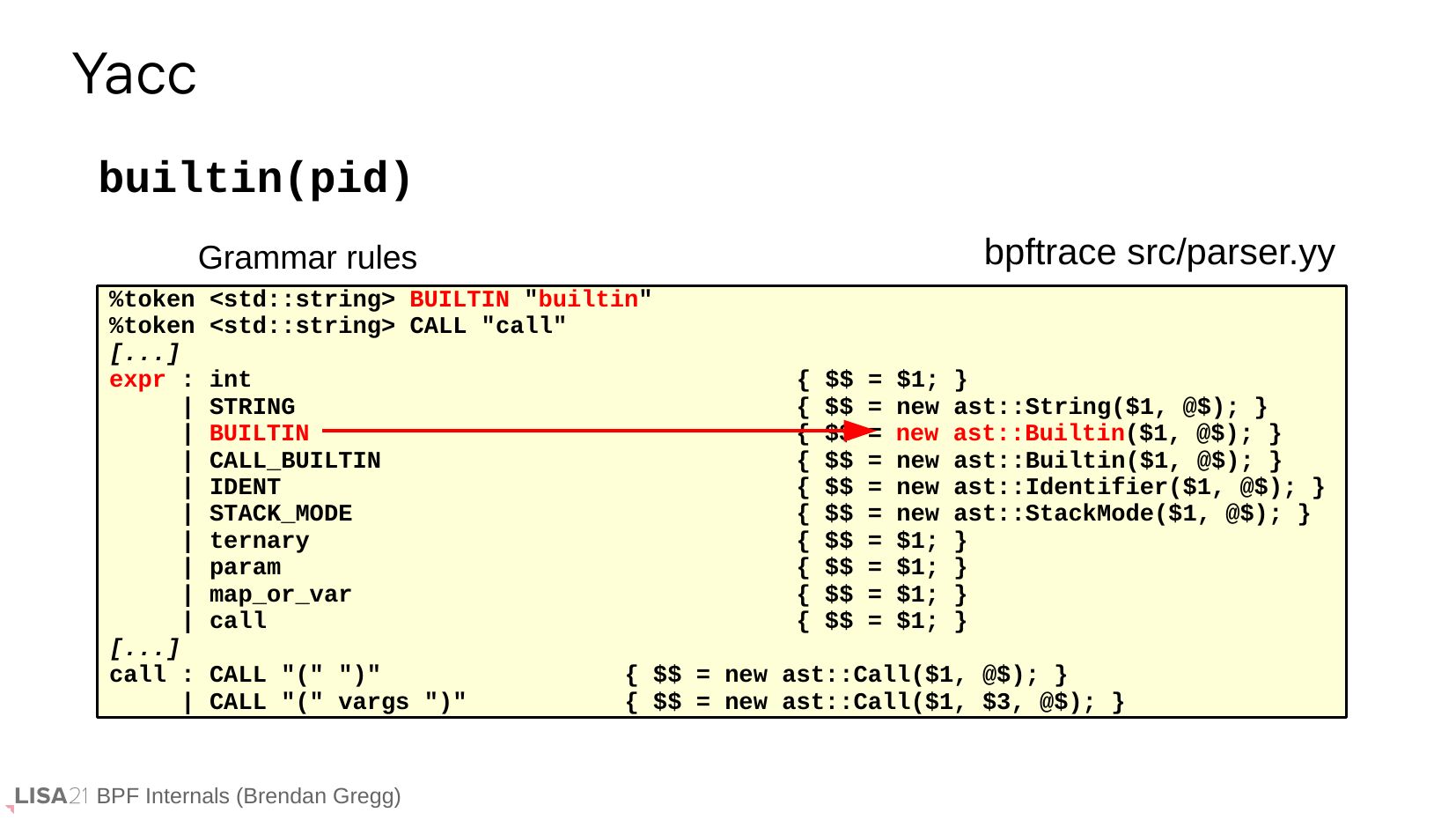slide 28:Yacc builtin(pid) Grammar rules bpftrace src/parser.yy %tokenslide 29:gt; BUILTIN "builtin" %token gt; CALL "call" [...] expr : int { $$ = $1; } | STRING { $$ = new ast::String($1, @$); } | BUILTIN { $$ = new ast::Builtin($1, @$); } | CALL_BUILTIN { $$ = new ast::Builtin($1, @$); } | IDENT { $$ = new ast::Identifier($1, @$); } | STACK_MODE { $$ = new ast::StackMode($1, @$); } | ternary { $$ = $1; } | param { $$ = $1; } | map_or_var { $$ = $1; } | call { $$ = $1; } [...] call : CALL "(" ")" { $$ = new ast::Call($1, @$); } | CALL "(" vargs ")" { $$ = new ast::Call($1, $3, @$); } BPF Internals (Brendan Gregg)