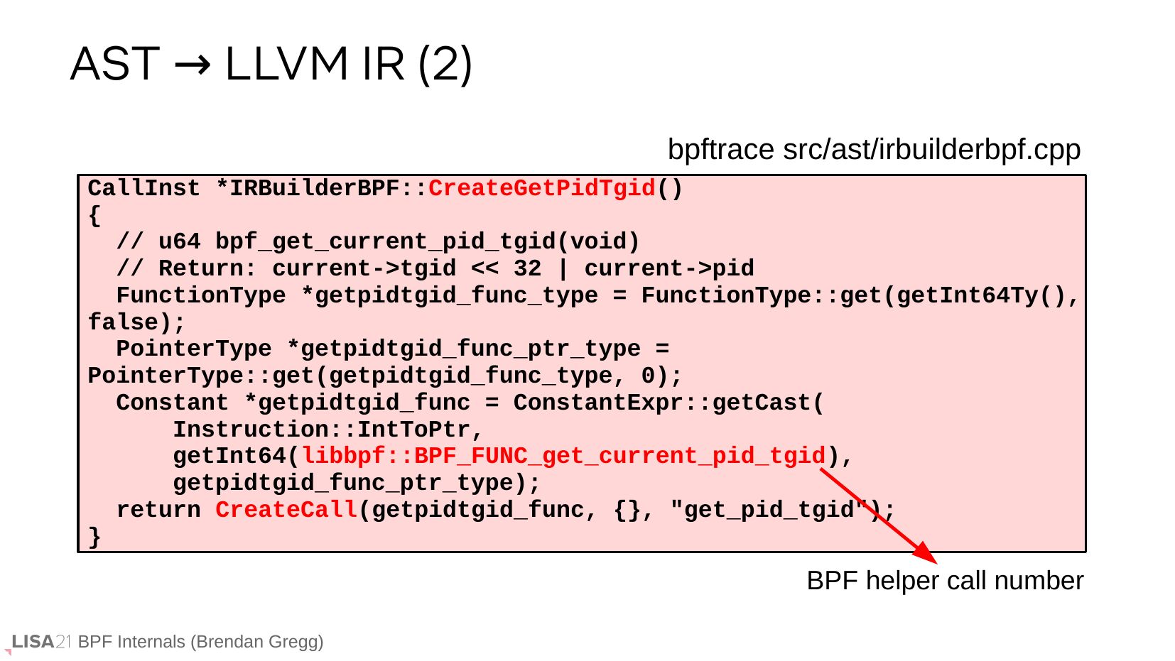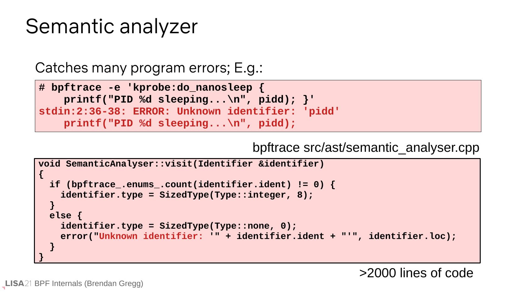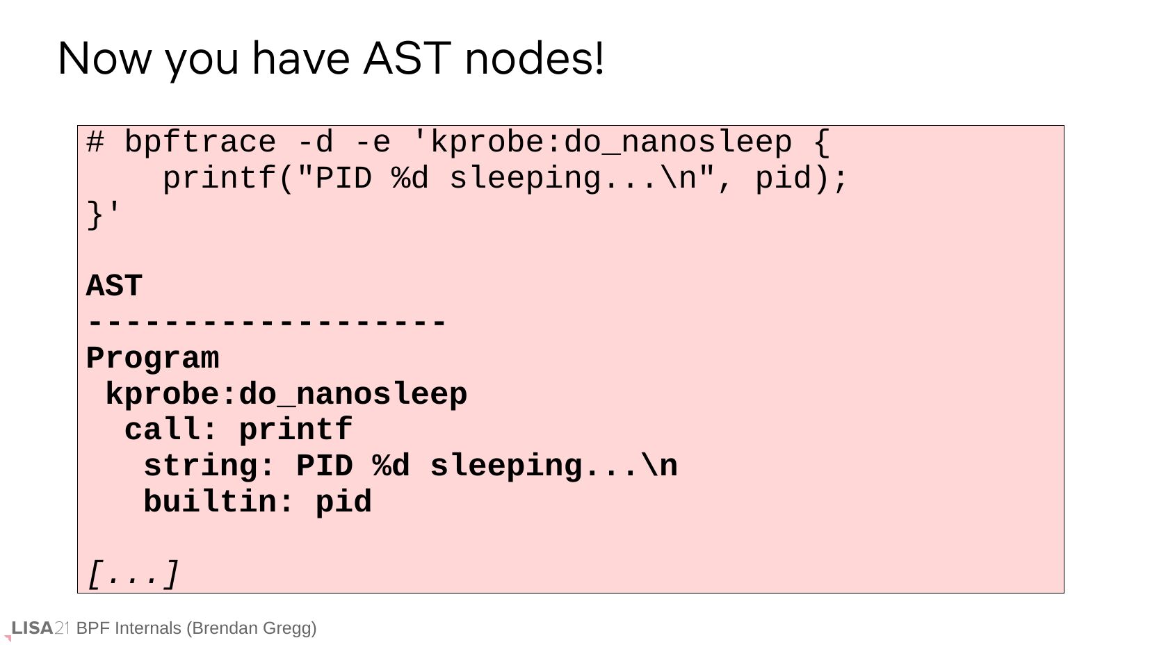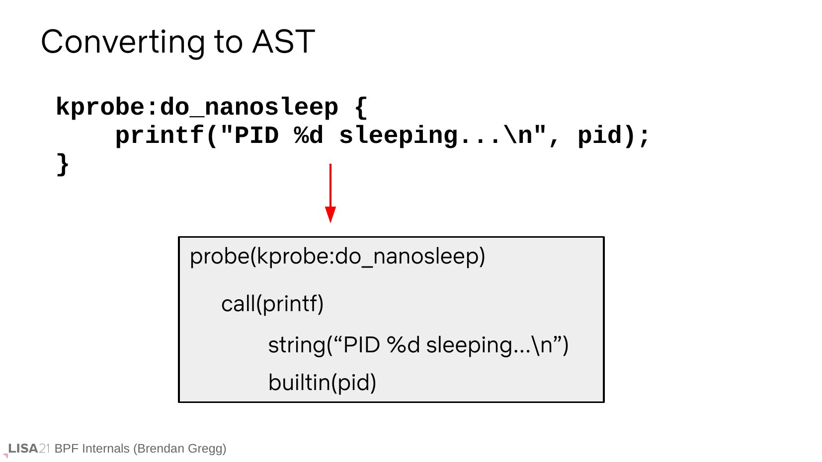 slide 28:Yacc builtin(pid) Grammar rules bpftrace src/parser.yy %tokenslide 29:gt; BUILTIN "builtin" %token gt; CALL "call" [...] expr : int { $$ = $1; } | STRING { $$ = new ast::String($1, @$); } | BUILTIN { $$ = new ast::Builtin($1, @$); } | CALL_BUILTIN { $$ = new ast::Builtin($1, @$); } | IDENT { $$ = new ast::Identifier($1, @$); } | STACK_MODE { $$ = new ast::StackMode($1, @$); } | ternary { $$ = $1; } | param { $$ = $1; } | map_or_var { $$ = $1; } | call { $$ = $1; } [...] call : CALL "(" ")" { $$ = new ast::Call($1, @$); } | CALL "(" vargs ")" { $$ = new ast::Call($1, $3, @$); } BPF Internals (Brendan Gregg)