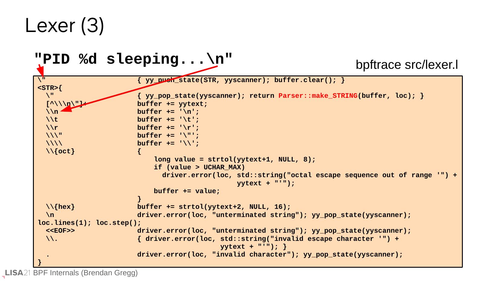 Lexer (3) "PID %d sleeping...\n"slide 32:gt;{ [^\\\n\"]+ \\n \\t \\r \\\" \\\\ \\{oct} bpftrace src/lexer.l { yy_push_state(STR, yyscanner); buffer.clear(); } { yy_pop_state(yyscanner); return Parser::make_STRING(buffer, loc); } buffer += yytext; buffer += '\n'; buffer += '\t'; buffer += '\r'; buffer += '\"'; buffer += '\\'; long value = strtol(yytext+1, NULL, 8); if (value >gt; UCHAR_MAX) driver.error(loc, std::string("octal escape sequence out of range '") + yytext + "'"); buffer += value; \\{hex} buffer += strtol(yytext+2, NULL, 16); driver.error(loc, "unterminated string"); yy_pop_state(yyscanner); loc.lines(1); loc.step(); gt;>gt; driver.error(loc, "unterminated string"); yy_pop_state(yyscanner); \\. { driver.error(loc, std::string("invalid escape character '") + yytext + "'"); } driver.error(loc, "invalid character"); yy_pop_state(yyscanner); BPF Internals (Brendan Gregg)