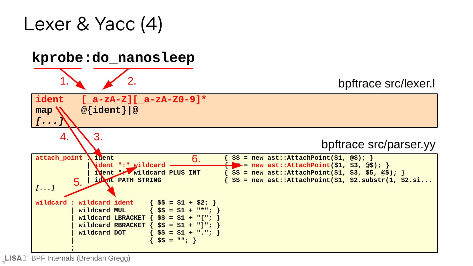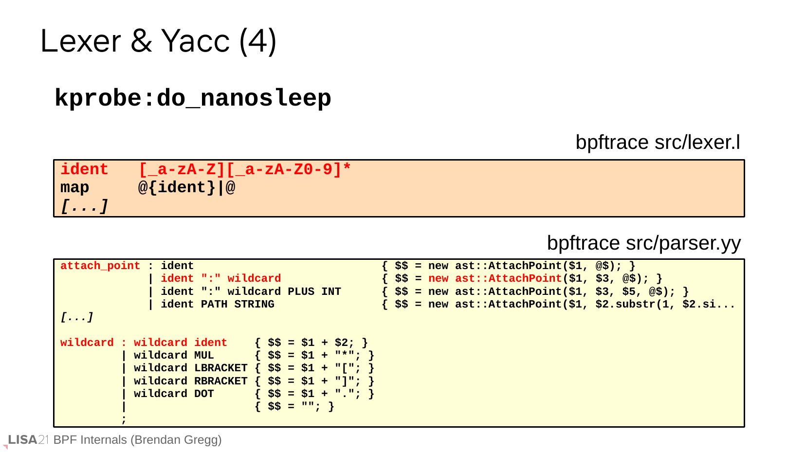 slide 30:Yacc (2) call(printf(...)); bpftrace src/parser.yy %tokenslide 31:gt; BUILTIN "builtin" %token gt; CALL "call" [...] expr : int { $$ = $1; } | STRING { $$ = new ast::String($1, @$); } | BUILTIN { $$ = new ast::Builtin($1, @$); } | CALL_BUILTIN { $$ = new ast::Builtin($1, @$); } | IDENT { $$ = new ast::Identifier($1, @$); } | STACK_MODE { $$ = new ast::StackMode($1, @$); } | ternary { $$ = $1; } | param { $$ = $1; } | map_or_var { $$ = $1; } | call { $$ = $1; } [...] call : CALL "(" ")" { $$ = new ast::Call($1, @$); } | CALL "(" vargs ")" { $$ = new ast::Call($1, $3, @$); } BPF Internals (Brendan Gregg)