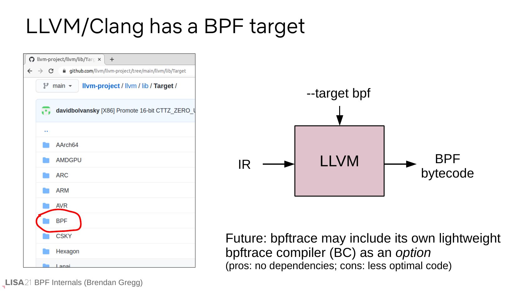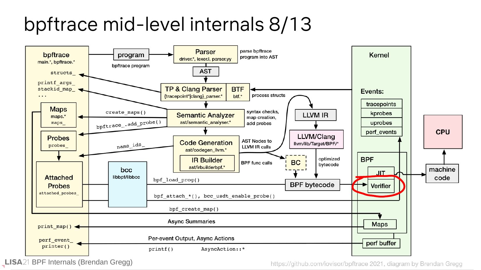 Description: "This talk is a deep dive that describes how BPF (eBPF) works internally on Linux, and dissects some modern performance observability tools. Details covered include the kernel BPF implementation: the verifier, JIT compilation, and the BPF execution environment; the BPF instruction set; different event sources; and how BPF is used by user space, using bpftrace programs as an example. This includes showing how bpftrace is compiled to LLVM IR and then BPF bytecode, and how per-event data and aggregated map data are fetched from the kernel."